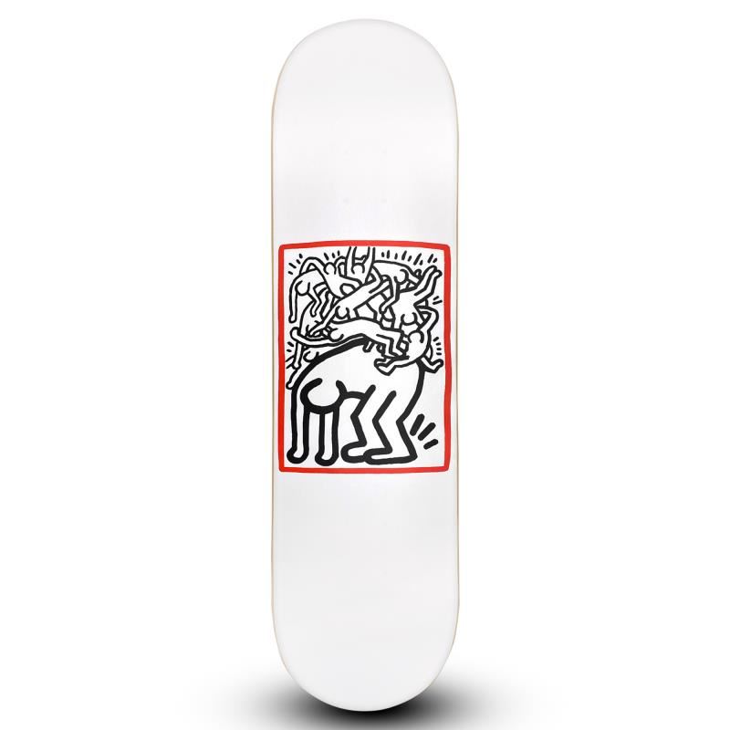 "Fight AIDS" is a skateboard by Keith Haring (1958-1990), bearing the plate signature of the artist inverso. Includes Letter of Authenticity. Measures approx. 32" x 8.5" (skateboard).