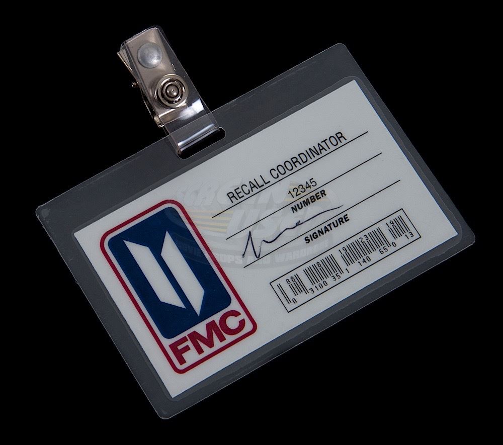 (Twentieth Century Fox, 1999) This Recall Coordinator badge was custom-made by the production for use by various actors during filming. The badge features the Federated Motor Corporation logo, employee number and signature. The badge is laminated and has an attached clothing clip. In addition to our ScreenUsed COA, this badge comes with a 20th Century Fox COA confirming its use during filming.