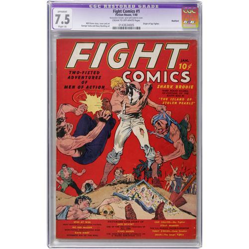 <B>Fight Comics #1 Rockford pedigree (Fiction House, 1940) Apparent CGC VF- 7.5 Slight (A) Cream to off-white pages.</B></I> Will Eisner's hand is all over this first issue of one of Fiction House's signature titles. Eisner created the cover, provided interior art, and even scripted a story. Two other Golden Age notables, George Tuska and Klaus Nordling, also did interior artwork for the issue, which featured the origin of Spy Fighter. CGC notes, "Restoration includes: spine split sealed to cover." Overstreet 2006 GD 2.0 value = $336; VG 4.0 value = $672; FN 6.0 value = $1,008; VF 8.0 value = $2,184.<BR><BR><b>Shipping:</b> Comics - Slabbed (certified) (<a target="_blank" href="http://www.heritageauctions.com/common/shipping.php">view shipping information</a>)