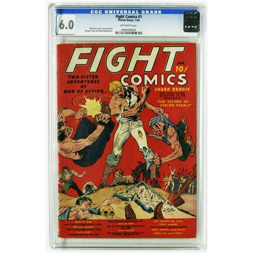 <B>Fight Comics #1 (Fiction House, 1940) CGC FN 6.0 Off-white pages.</B></I> Before converting to a war theme, this title was focused more on two-fisted types, both fictional (Shark Brodie, Kayo Kirby) and real-life (Jack Dempsey). Art by the Iger shop meant that greats Lou Fine (cover art) and Will Eisner contributed to the first issue of this series' thirteen-year run. Overstreet 2005 FN 6.0 value = $1,002. CGC census 12/05: 3 in 6.0, 2 higher.
