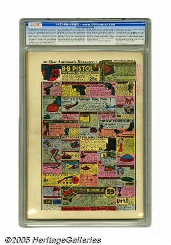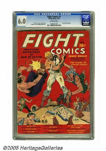 <B>Fight Comics #1 (Fiction House, 1940) CGC FN 6.0 Off-white pages.</B></I> Fiction House titles were Golden Age staples, featuring some of the best artists the era. For the inaugural issue of <B>Fight</B></I>, Will Eisner offered one of his most dynamic covers, and provided interior artwork along with George Tuska and Klaus Nordling. The origin of the Spy Fighter is featured. Just one copy at 7.0 and another at 6.5 have earned higher grades from CGC to date. CGC notes, "Tape stain on cover." Overstreet 2005 FN 6.0 value = $1,002. CGC census 6/05: 3 in 6.0; 2 higher.