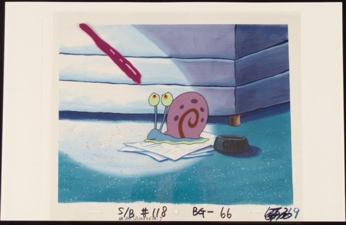 This reproduction background and animation cel is from the Nickelodeon TV show SpongeBob Squarepants. The story takes place under the deep blue sea in Bikini Bottom, where SpongeBob resides. SpongeBob, who is a yellow, porous sponge, is your typical happy-go-lucky character, as he is always cheerful and enjoys making people laugh. Patrick Star, SpongeBob's neighbor who is a starfish, is your average children's show idiot, as he boasts knowing nothing and is often getting himself into ridiculous situations. Between the homes of these two lies the home of the miserable Squidward, a squid, who is known for being grouchy and playing tricks on SpongeBob and Patrick. Both SpongeBob and Squidward work at the Krusty Krab, a fast food business run by the greedy money-loving Mr. Krabs, a crab, the arch rival of the evil, possibly misunderstood, Plankton. Another neighbor, Sandy Cheeks, an athletic squirrel who normally wears an astronaut's space suit, was introduced in "Tea at the Treedome." She spends most of her time inventing and experimenting. The jellyfish and Gary are fighting.Original Printed Background and Animated Cel Overall Size of Background: 10 1/2" x 17" Overall Size of the Cels: 10 1/2" x 12 1/2" Very good conditionThis is an original hand-painted cel set-up used in the production of an episode of "SpongeBob SquarePants." Each one-of-a-kind set-up represents a slight change in position of the characters. When individually photographed and projected in rapid succession, the images appear to move.
