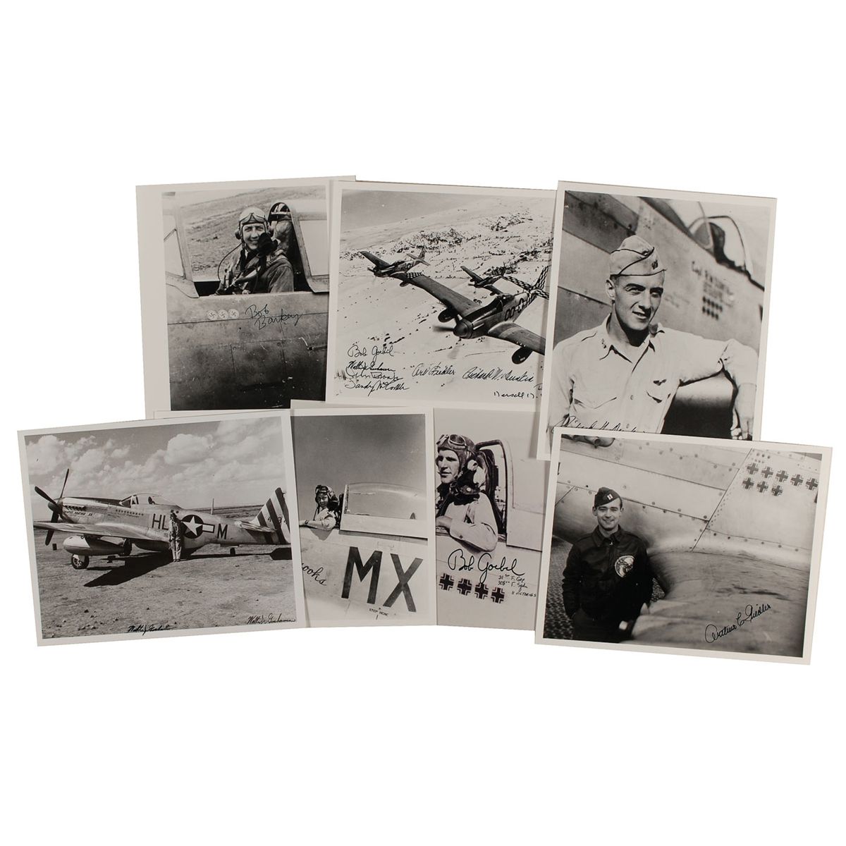 Seven glossy photos, 10 x 8 and two 8 x 10s, each signed in black felt tip by the respective Fighter Ace pilot pictured, with one photo featuring a P-51 Mustang, signed by eight pilots. Signers are: Bob Goebel (2), Walter Goehausen (2), Jim Brooks (2), Art Fielder (2), Richard Dunkin (2), Bob Barkey (2), and Herky Green, with some adding rank and mission. In fine condition.