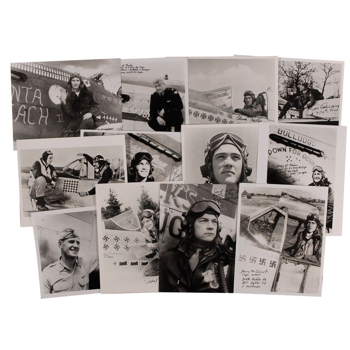 Twelve glossy 8 x 10 and 10 x 8 photos, each signed in black felt tip by the respective Army Air Corps Fighter Ace pilot pictured, all of whom had at least five victories against Germany. Signers are: R. C. Curtis, Jim Goodson, Don Bryan, George Loving, William King, Jack Ilfrey, “Willie Y” Anderson, Gordon Graham (2), and Ken Dahlberg, with some adding rank and mission. In fine condition.