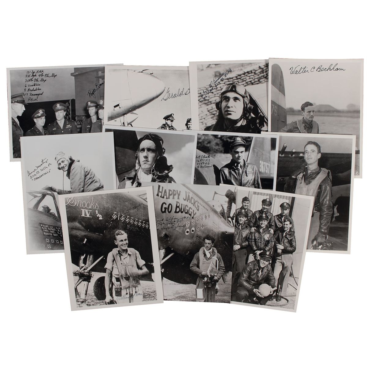 Eleven glossy 8 x 10 photos, including two 10 x 8s, each signed in ink or felt tip by the respective Army Air Corps Fighter Ace pilots pictured, all of whom had at least five victories against Germany. Signers are: William Sloan, Gerald Brown, Jack Ilfrey, Frank Hurlbut, George Novotny, Harley Brown, Robert Booth, Walter Beckham (2), Steve Pisanos, and Roy Evans, with some adding rank and mission. In fine condition, with light contrast to a few of the signatures.