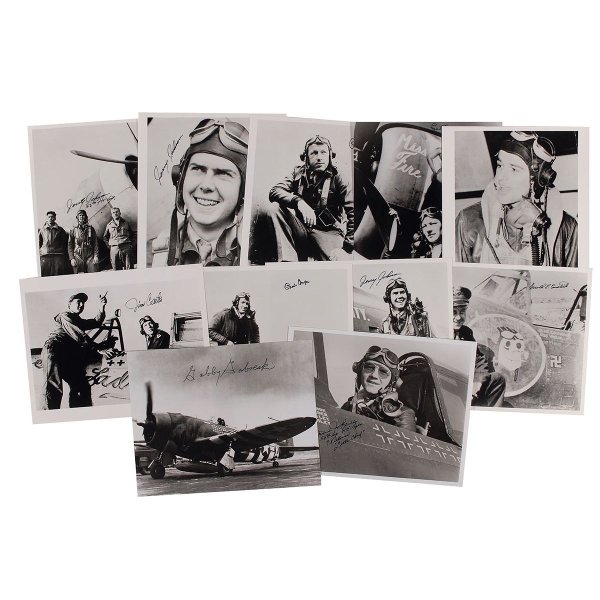 Eleven glossy 8 x 10 and 10 x 8 photos, each signed in black felt tip by the respective Fighter Ace pilot pictured, all of whom were members of Hub Zemke’s 56th Fighter Group. Signers are: Gabby Gabreski, Frank Klibbe, Bud Mahurin, Fred Christensen, Jim Carter, Harold Comstock, Paul Conger (2), and Jerry Johnson (3), with some adding rank. In fine condition.