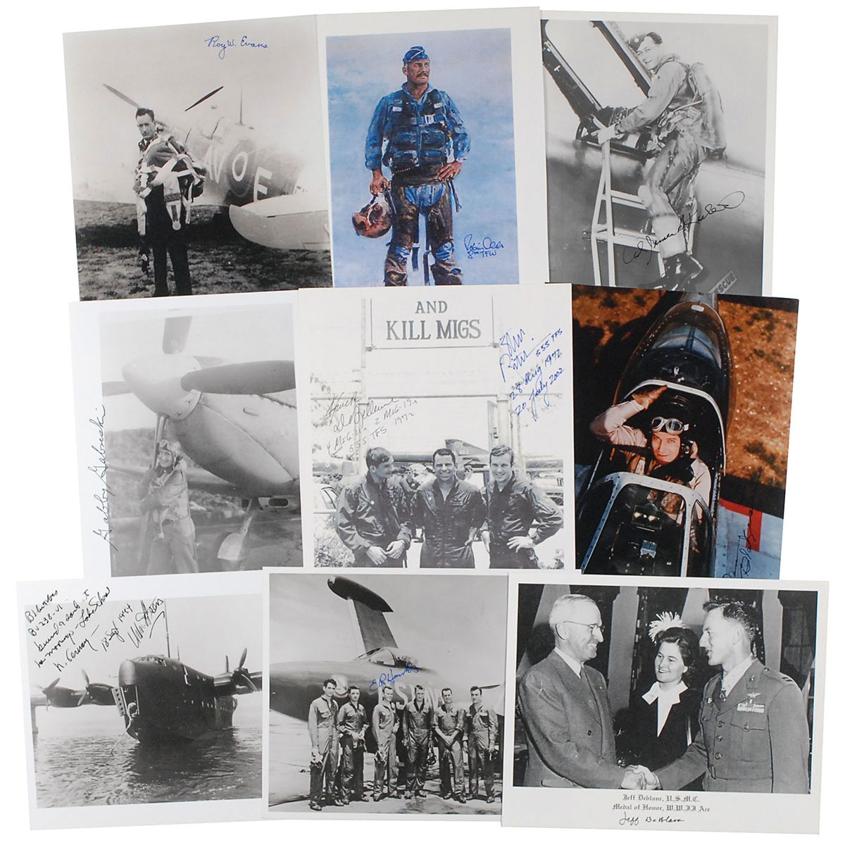 Collection of nine photos, various finishes, all 8 x 10 or slightly larger, each signed in ink or felt tip by the ace pictured. Signers are: James Kasler, Robin Olds, Roy W. Evans, Don Blakeslee, Jeff DeBlanc, Urban L. ‘Ben’ Drew, E. R. Hanks, Gabby Gabreski, and Steve Ritchie and Chuck DeBellevue. In fine condition.