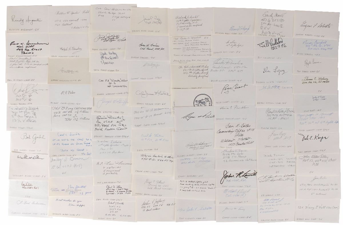 Impressive collection of 75 signatures of American World War II fighter aces on individual off-white 5 x 3 cards, with many adding their squadron, plane type, or victory count, including: William Allen, C. E. ‘Bud’ Anderson, Richard W. Asbury, Robert W. Aschenbrener, Rudolph Augarten, George C. Axtell, Ernest Bankey, Joseph H. Bennett, Jim Billo, John Bolt, Robert Booth, Harley L. Brown, Donald Bryan, Robert Coats, Roger Conant, Clement Craig, Niven Cranfill, Bill Cullerton, James N. Cupp, Glendon Davis, Phil DeLong, Archie Donahue, James England, Roy Evans, Mick Finn, Cecil Foster, Dwaine R. Franklin, Robert E. Galer, Bob Goebel, Gordon Graham, Joseph Griffin, Clayton Kelly Gross, E. R. Hanks, Harry Hill, Donald E. Hillman, Kenneth Hippe, George Hollowell, Arthur Jeffrey, Kenneth Jernstedt, Arthur Johnson, Dale Karger, James Kasler, Frank W. Klibbe, William E. ‘Lam’ Lamoreaux, Marlow Leikness, Donald Lopez, George Loving, John Lowell, Thomas E. Maloney, Lyndon O. Marshall, Donald M. McPherson, Harris Mitchell, Sanford K. Moats, Paul C. Murphey, Jr., Robin Olds, Kenneth ‘Bud’ Pool, Edward S. Popek, Ralston M. Pound, Jr., Royce Priest, Jack Purdy, Michael Quirk, James F. Rigg, Paul Riley, Eugene Roberts, Duerr Schuh, Sam L. Silber, Carl Smith, Donald Strait, John Sublett, Richard C. Suehr, John Alden Tilley, Ralph Wandrey, Wilbur B. ‘Spider’ Webb, Edward Wendorf, and Calvin Wire. In overall fine condition.