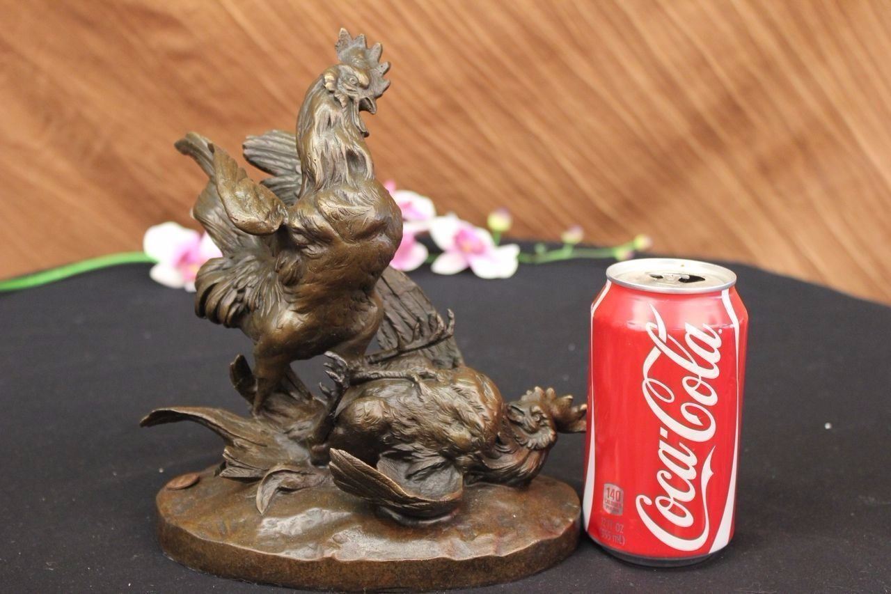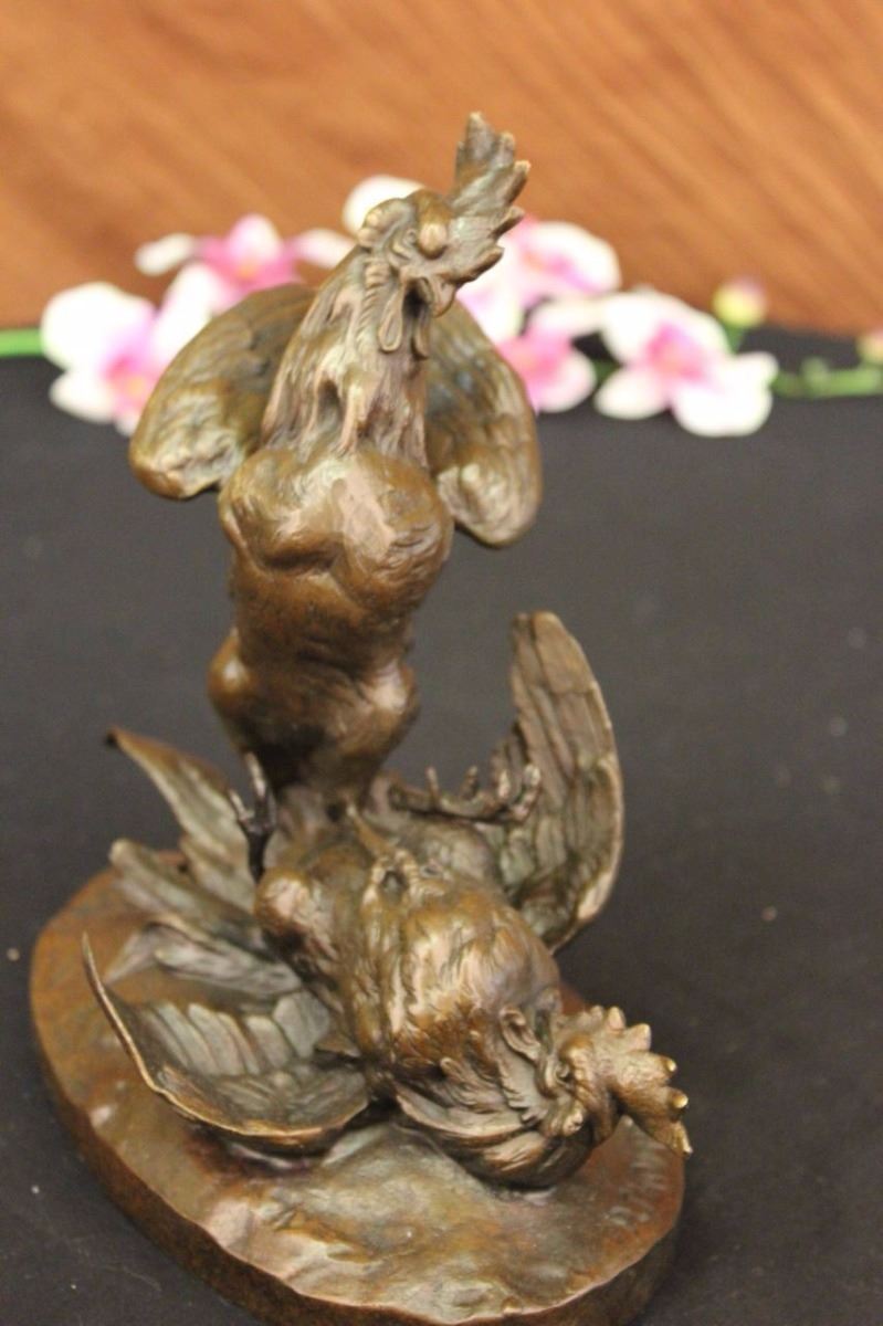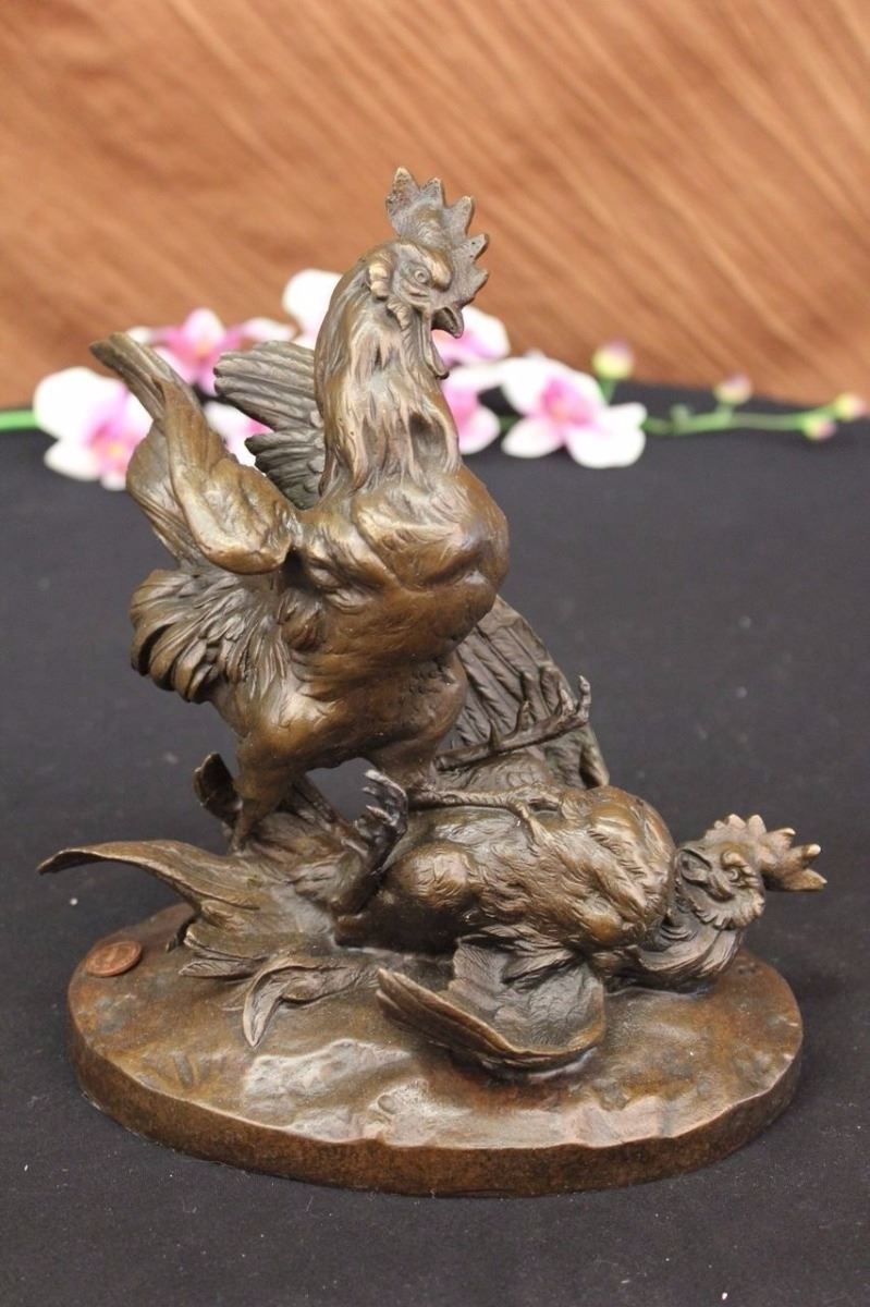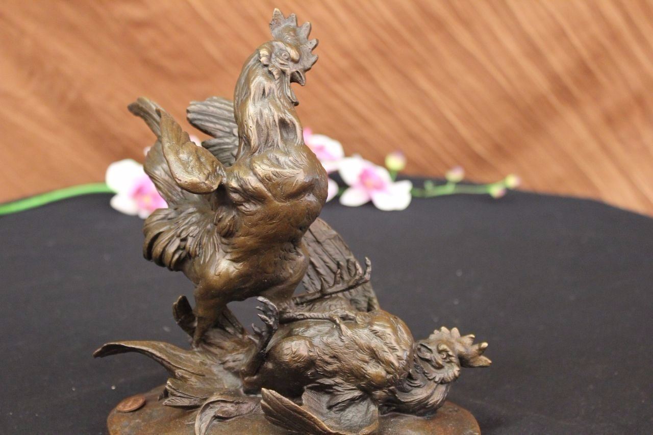 Two roosters engage in a good old fashioned cock fight. They chargeand peck at each other like fierce enemies but there is only room forone head rooster and he has taken his rightful place standing on topof the losing roosters colorful chest. This cocky rooster hold hishead up proudly and puffs out his chest, practically posing for thecameras. His tiny wings perk up behind him in a boasting fashion, as he glares down at his opponent. If you look closely at this carefully detailed sculpture, you can even see the roosters fierce scowl. 100% bronze and handmade this brown patina sculpture was cast using the Lost Wax Method and mounted on a marble base. Bronze Dimensions: Height 9 x Width 10 inches. Weight: 5 LBS.