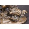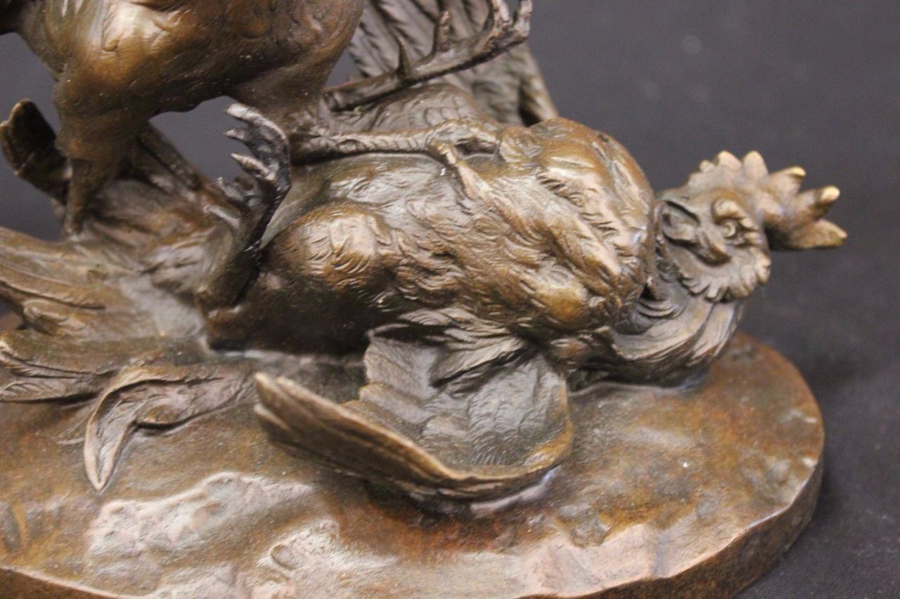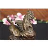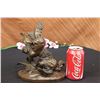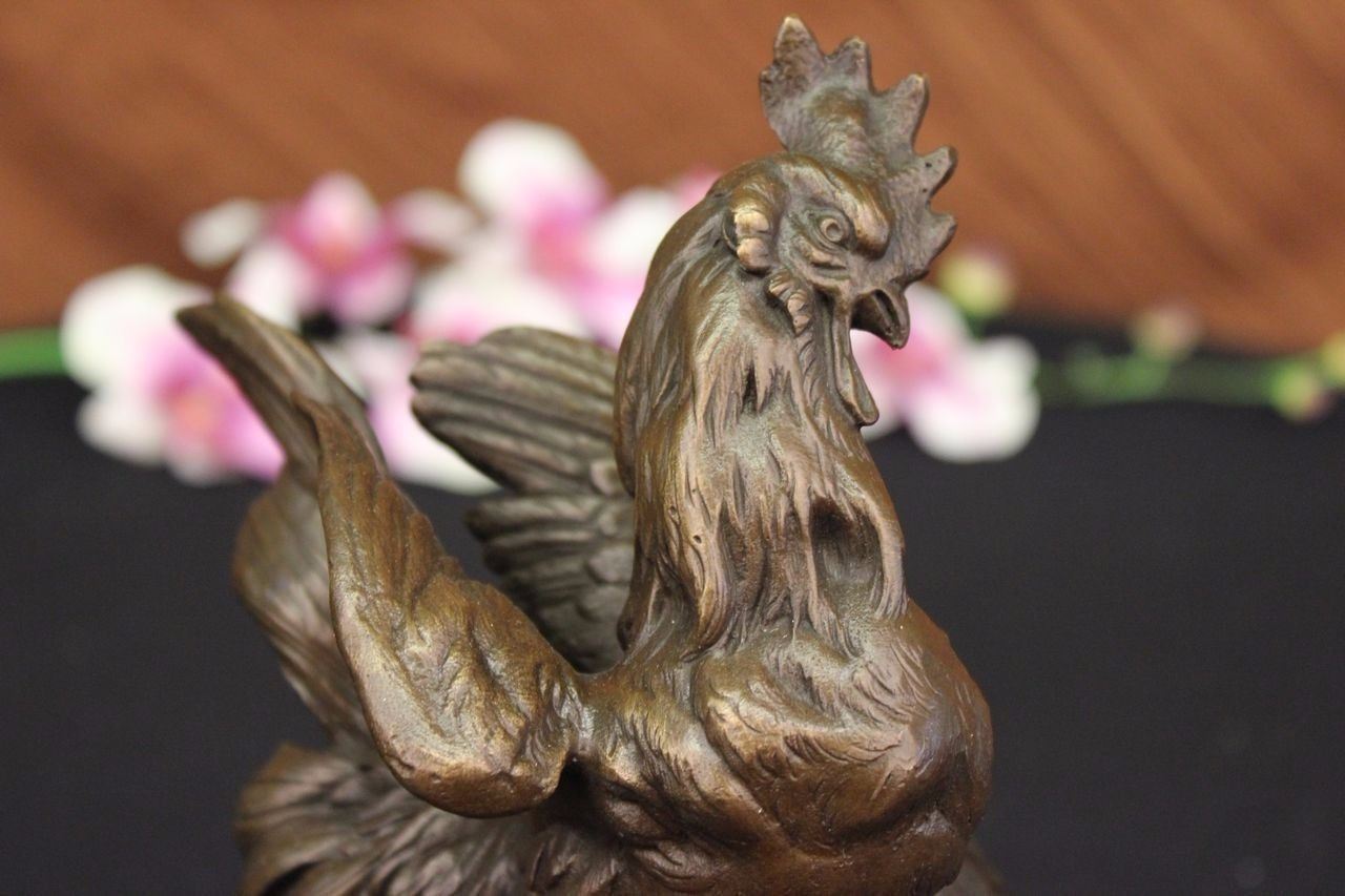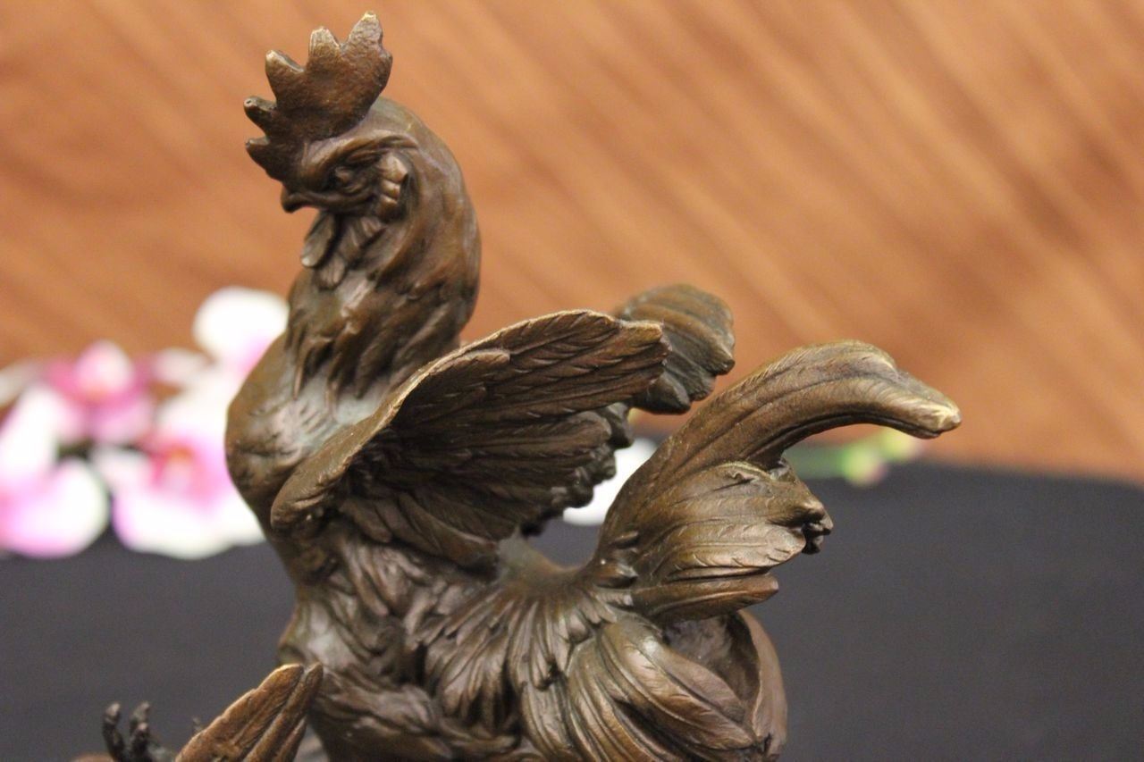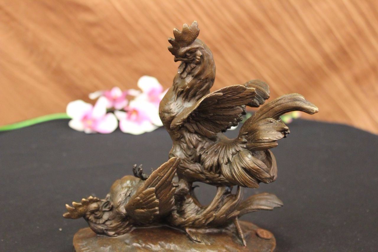 Two roosters engage in a good old fashioned cock fight. They chargeand peck at each other like fierce enemies but there is only room forone head rooster and he has taken his rightful place standing on topof the losing roosters colorful chest. This cocky rooster hold hishead up proudly and puffs out his chest, practically posing for thecameras. His tiny wings perk up behind him in a boasting fashion, as he glares down at his opponent. If you look closely at this carefully detailed sculpture, you can even see the roosters fierce scowl. 100% bronze and handmade this brown patina sculpture was cast using the Lost Wax Method and mounted on a marble base. Bronze Dimensions: Height 9 x Width 10 inches. Weight: 5 LBS.