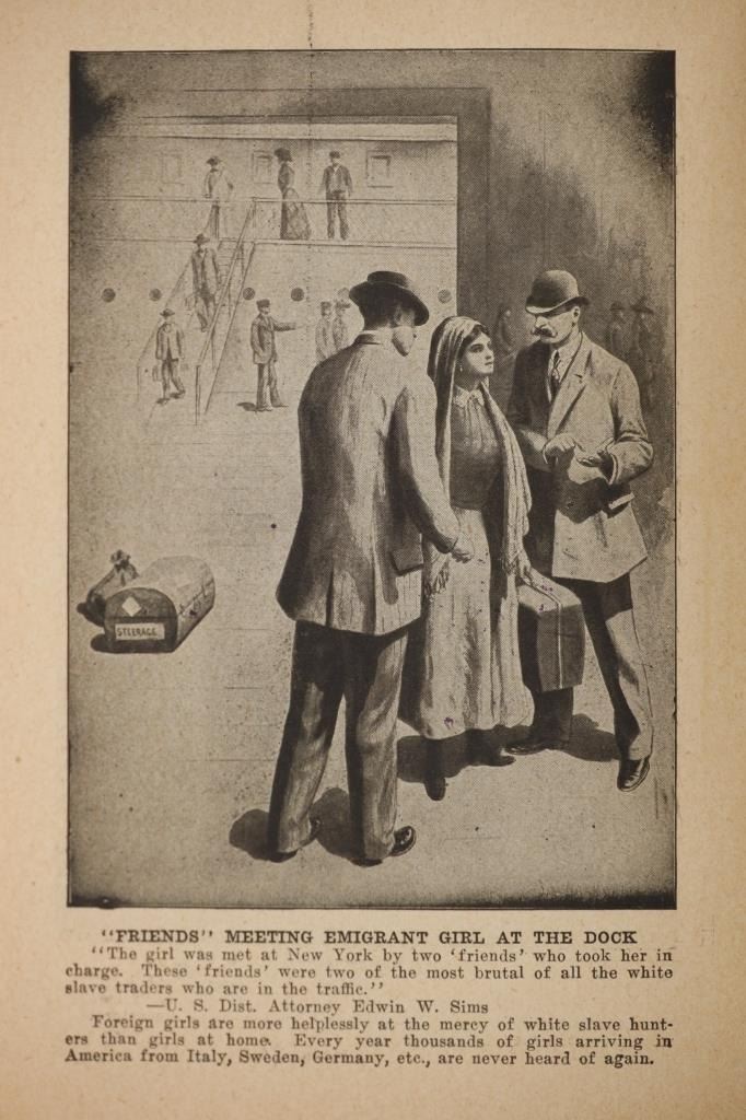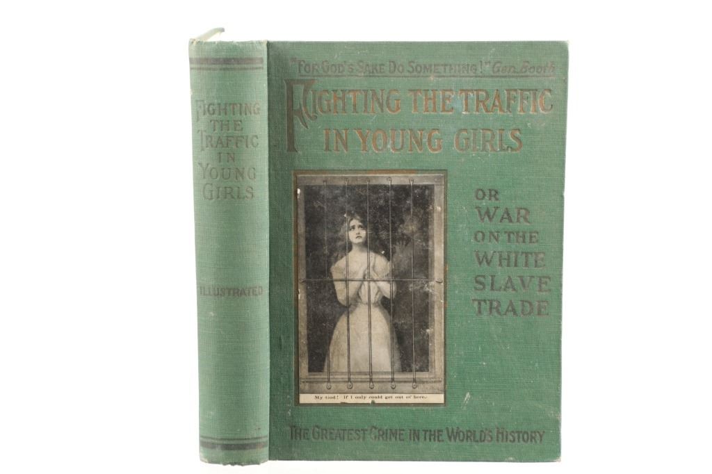 Offered in this lot is this 1911 copy of "Fighting the Traffic in Young Girls: Or War on The White Slave Trade" by Ernest A. Bell. An excerpt from the title page reads, "A complete and detailed account of the shameless traffic in young girls...How to save YOUR GIRL. How to save YOUR BOY...A book designed to awaken the sleeping and protect the innocent." The book includes thirty-two pages of striking pictures. The fact that this book was written over 140 years ago about a curse that still exists today is amazing. This green cloth bound gold gilt illustated hardcover is fair, scuffing exhibited to cover edges. Gold gilt on front cover pictorial border is mostly faded. Intact pages show age tanning and foxing consistent with the age of the book. The measurements of this book are 6.25"W x 8.5"L x x 1.25"D, weight 1lb, 6oz.