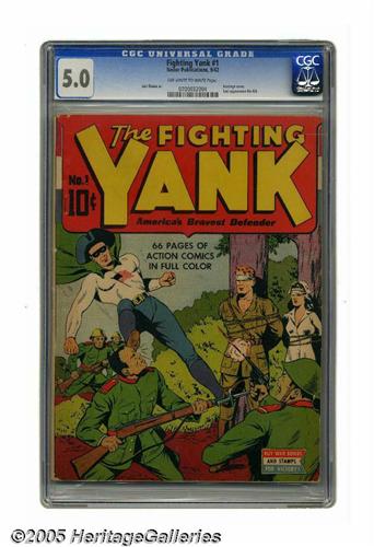 <B>Fighting Yank #1 (Nedor Publications, 1942) CGC VG/FN 5.0 Off-white to white pages.</B></I> This premiere issue features art by Jack Binder. Also of note is the only appearance in this series of the range-ridin' Rio Kid. Overstreet 2005 VG 4.0 value = $554; FN 6.0 value = $831. CGC census 3/05: 1 in 5.0, 4 higher.