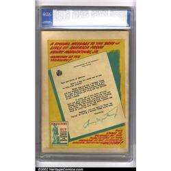 Fighting Yank #1 Pennsylvania pedigree (Nedor Publications, 1942) CGC VF+ 8.5 Off-white pages. Captain America wasn't the only defender of freedom in comic books during WWII; Nedor entered the fray in 1941 by introducing the Fighting Yank in Startling Comics #10. By the following year, the Yank had proven to be popular enough to earn his own book in order to keep fighting the good fight. Mystico and Wonder Man stories back up the Yank, and the bondage cover is a real eye-catcher. This solid, high-grade copy comes from the esteemed Pennsylvania collection, a pedigree that is revered in the hobby. Flat and clean with a nice cut, off-white pages and secure staples, this glossy book could very well be the bargain of this auction. Overstreet 2002 VF 8.0 value = $1,534. Important notice: We expect to be auctioning lots at the rate of 200-250 per hour. Sometimes eBay Premier live bid software cannot keep up with that pace, so we strongly recommend that you place a realistic proxy bid now as insurance to avoid disappointment. Also please note that all Heritage/CAA lots purchased through eBay Premier carry a 20% Buyer's Premium.