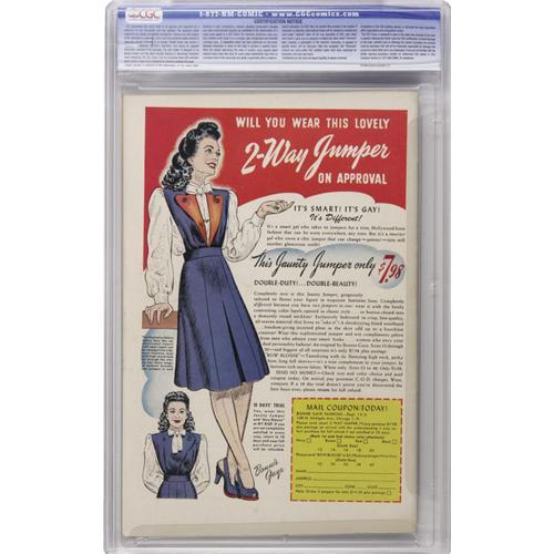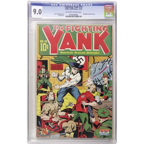 <B>Fighting Yank #10 (Nedor Publications, 1944) CGC VF/NM 9.0 Off-white to white pages.</B></I> Bondage, torture, Nazis, and even the dreaded hypodermic needle would be enough to pique collectors' interest here, but of course the best part is that it's all drawn by Alex Schomburg. Overstreet 2006 VF/NM 9.0 value = $630; NM- 9.2 value = $860. CGC census 9/06: 2 in 9.0, 2 higher.<BR><BR><b>Shipping:</b> Slabbed Comic (<a target="_blank" href="http://www.heritageauctions.com/common/shipping.php">view shipping information</a>)