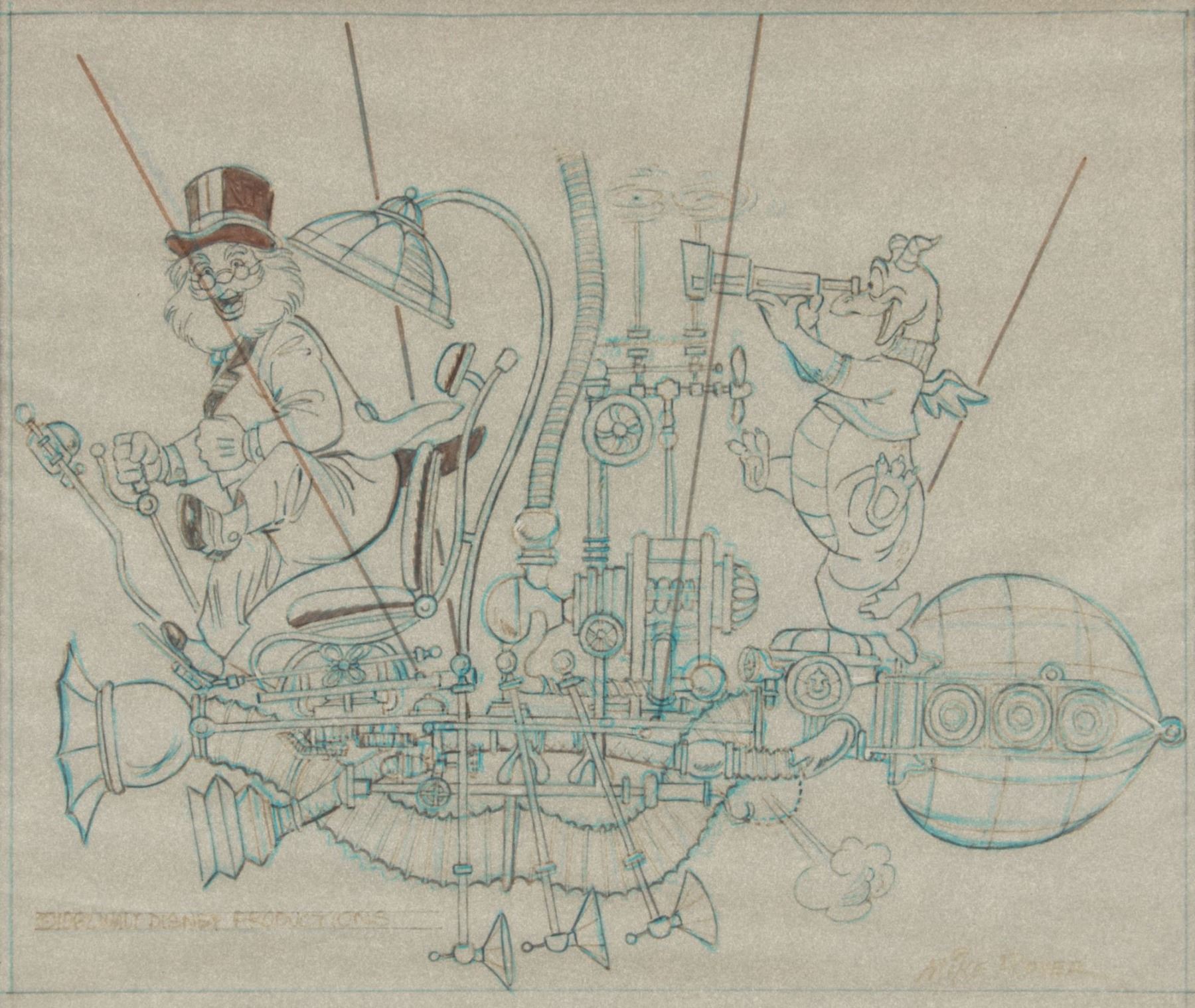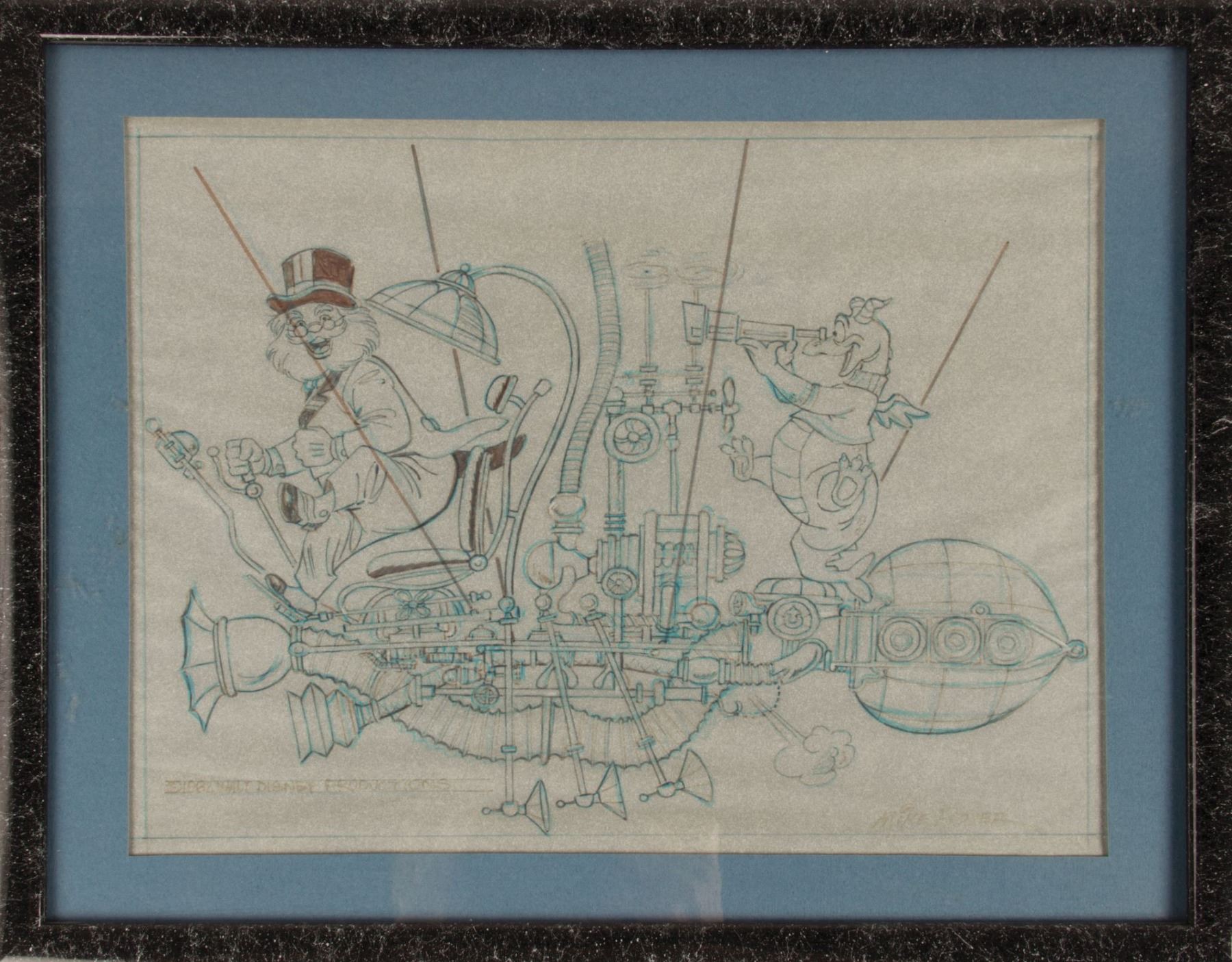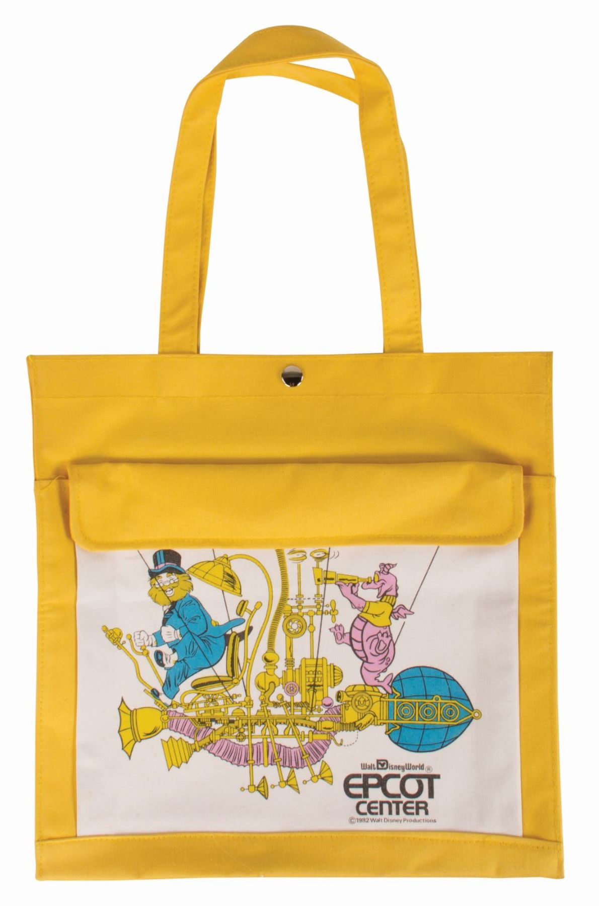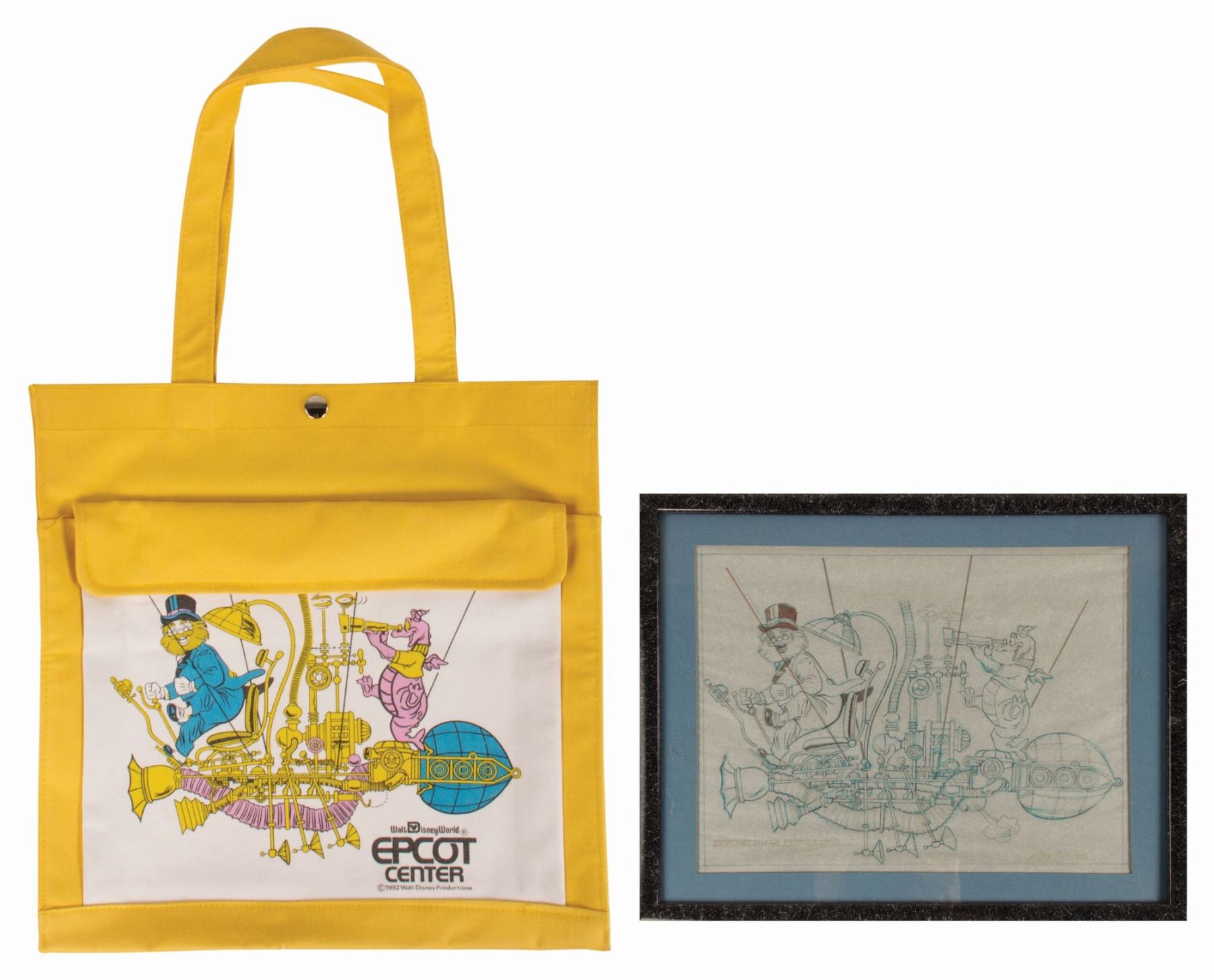 (Epcot, 1982) A vintage tote bag from Epcot featuring Figment & Dreamfinder that includes the original pencil artwork used to create the tote. Accomplished in blue and black pencil on this art paper, the drawing comes custom framed and measures approximately 9"x11". The tote measures 13.5"x14", and both items are in very good condition with minor wear.