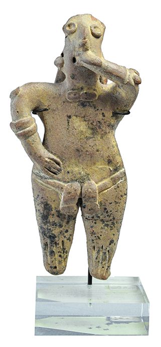 Figura antropomorfa. Colima, México occidental. Periodo pre-clásico (siglos I a.C. - III d.C.). Cerámica. Altura 11,5 cm. Colección privada española, comprada en subastas Drouot, París. Incluye peana.
