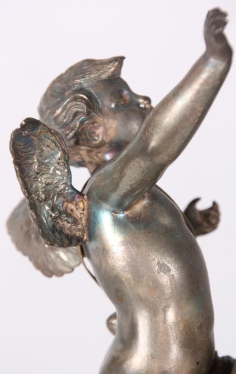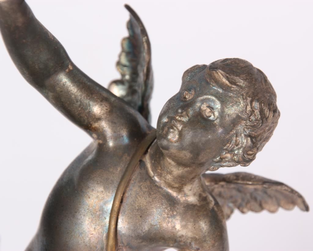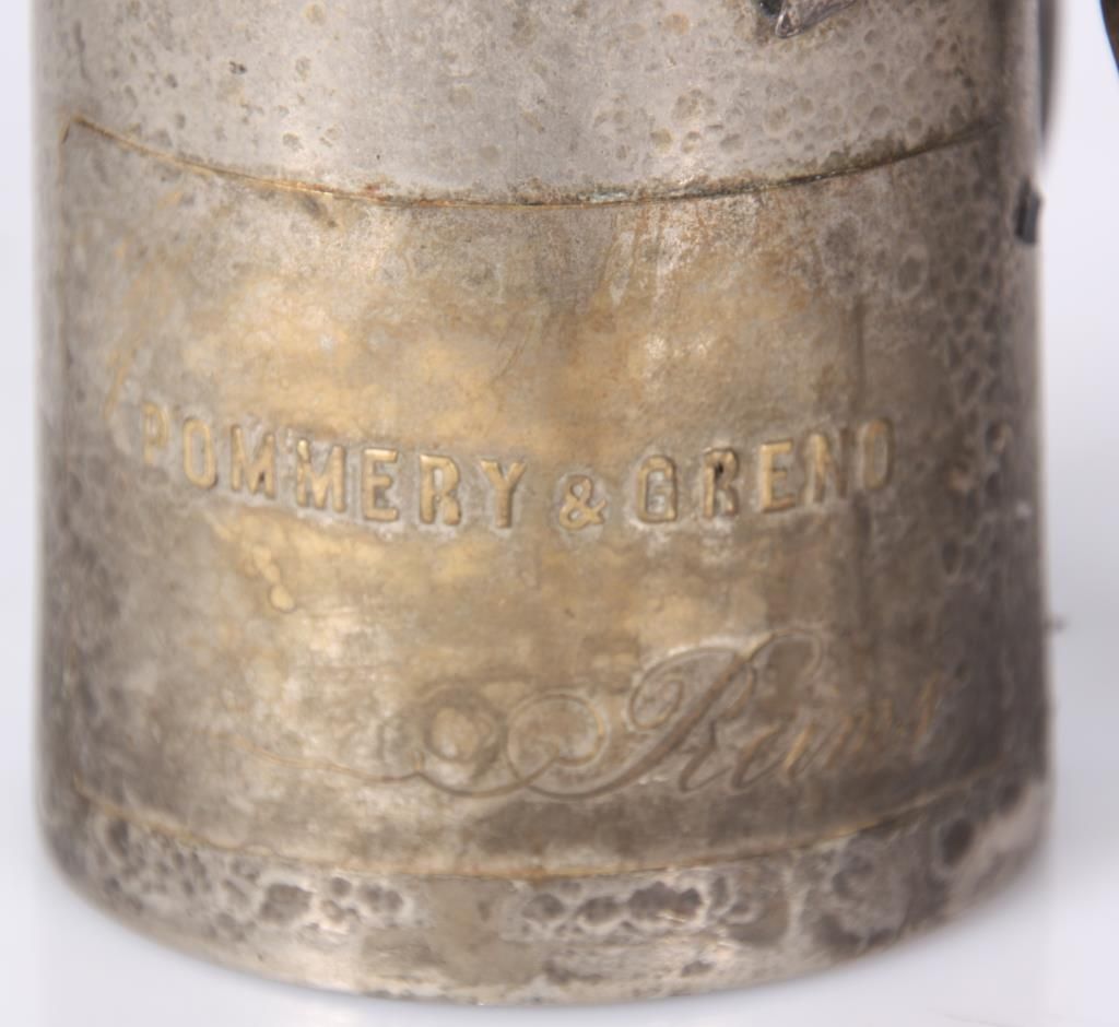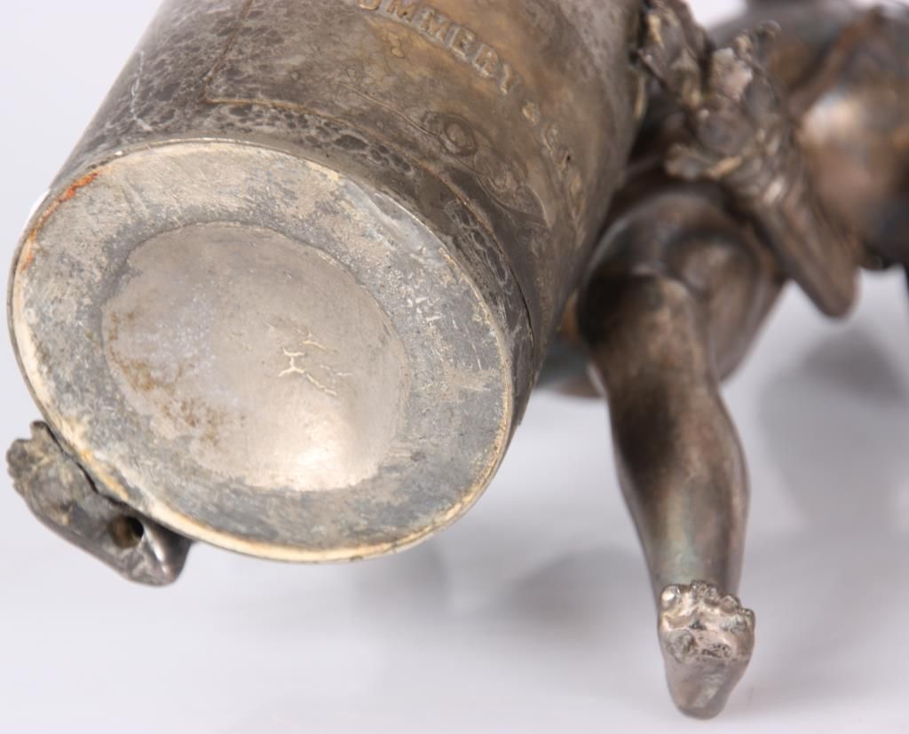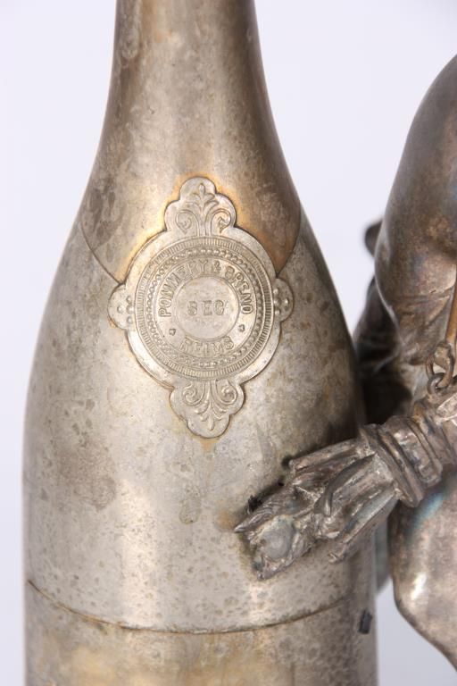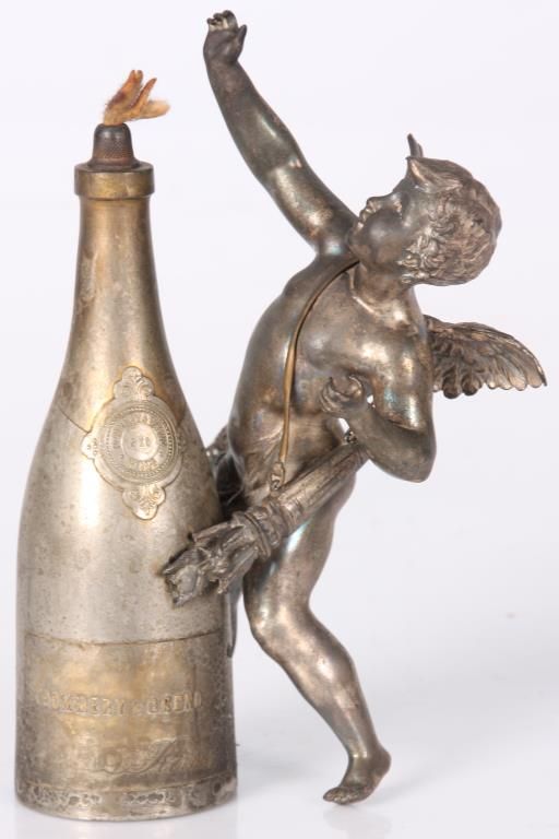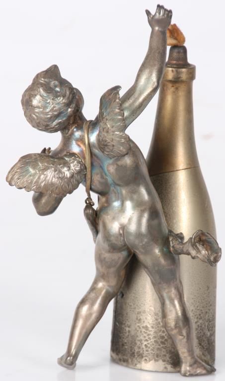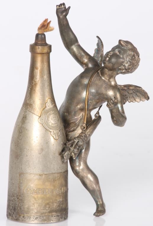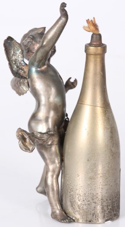 Figural Silver Plated Advertising Cigar Lighter. Winged figure of cupid stands in a dynamic pose beside a bottle of Pommery & Greno, Reims champagne; the hollow bottle acts as an oil font with wick at the top for the lighter. Silver plating is worn off, otherwise in good condition. 7 in. high