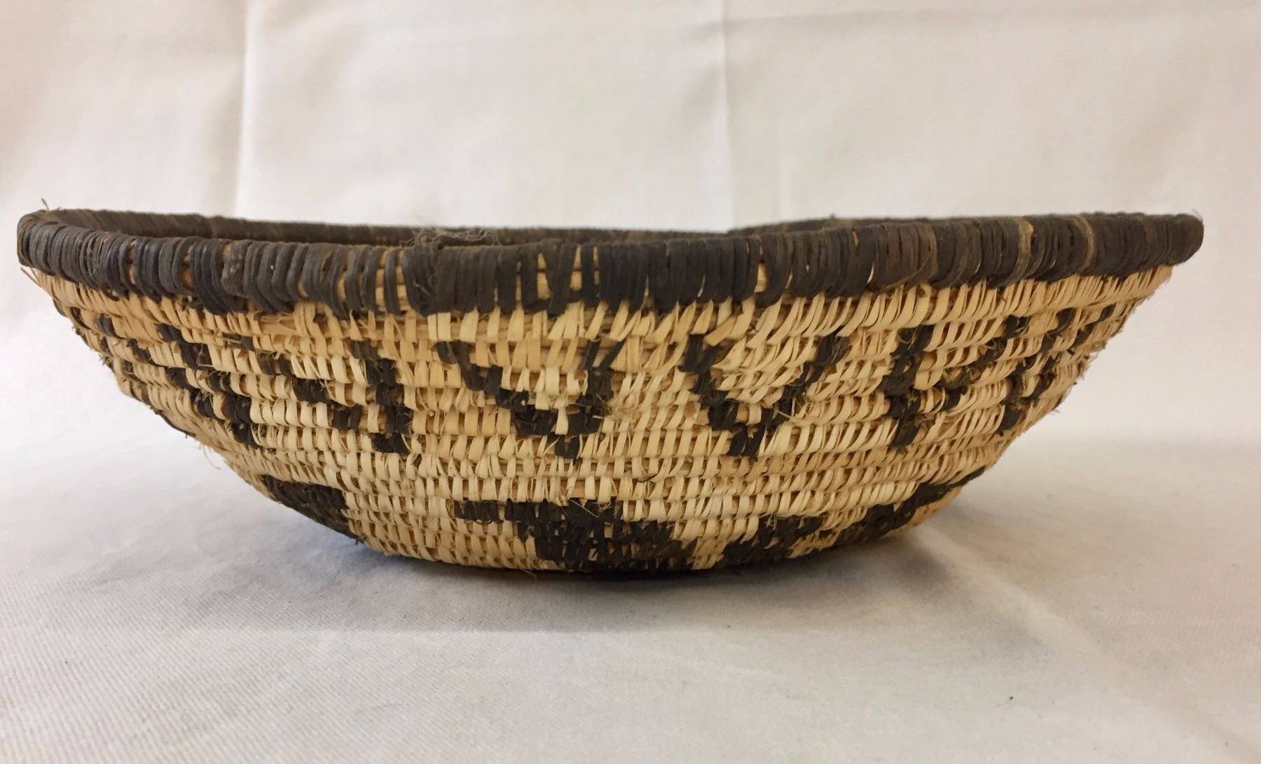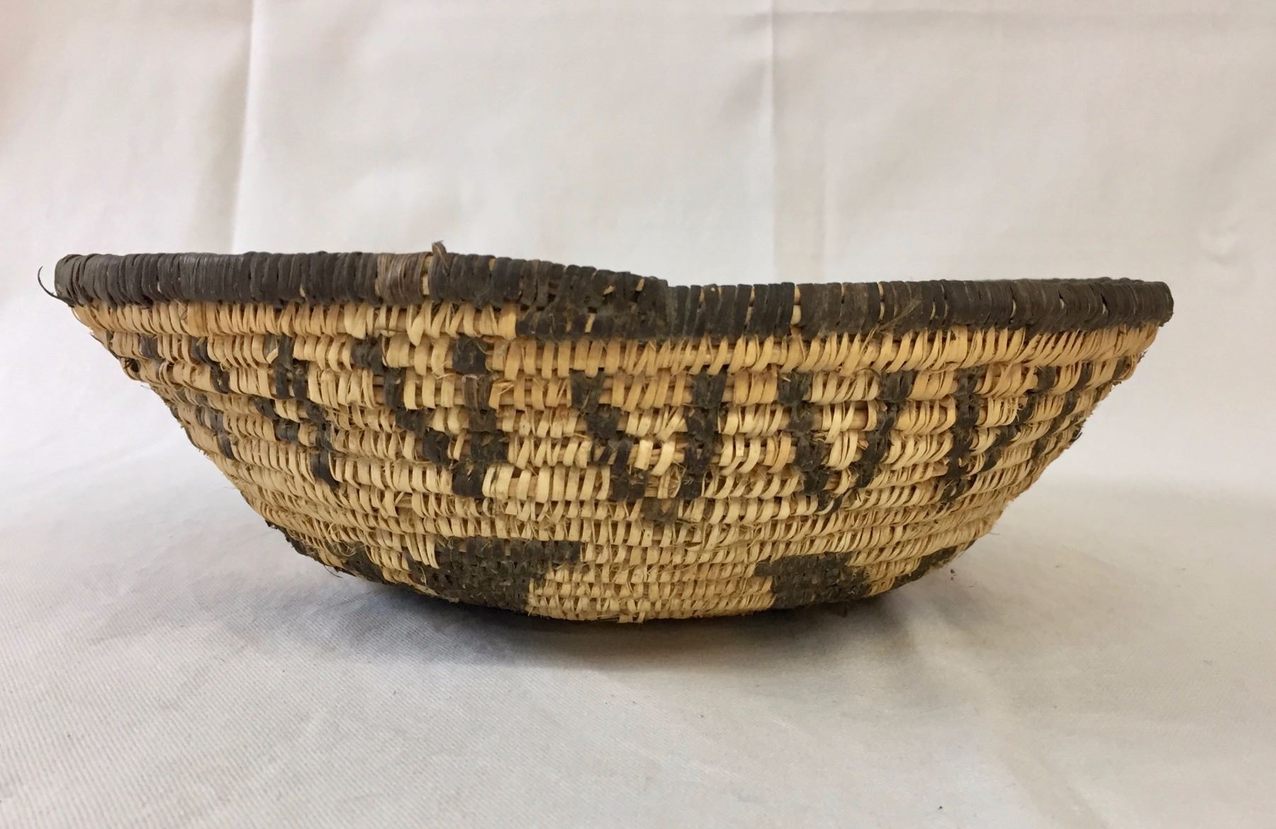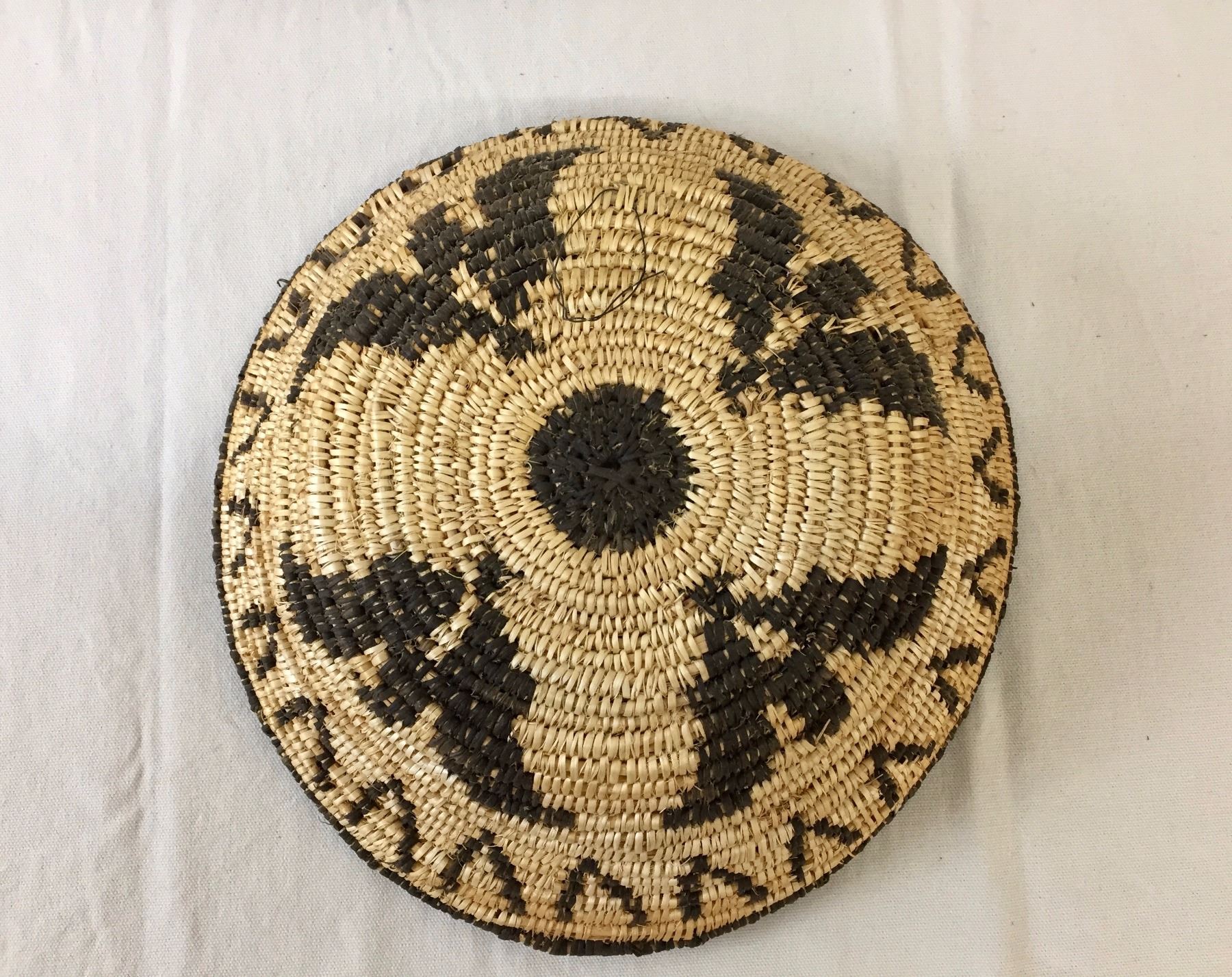 Description: A handmade Apache basket. Devil’s claw and willow. Maker: Unknown Apache weaver. Approx. Age: Fairly modern, circa 1980s. Size: 4” deep x 11” wide. Condition: Good for its age, normal wear expected. Please look closely at the pictures - they are an important part of our description. Shipping: There will be a $7 handling / packaging fee for shipping this lot. The actual cost of postage will be added on top of that.