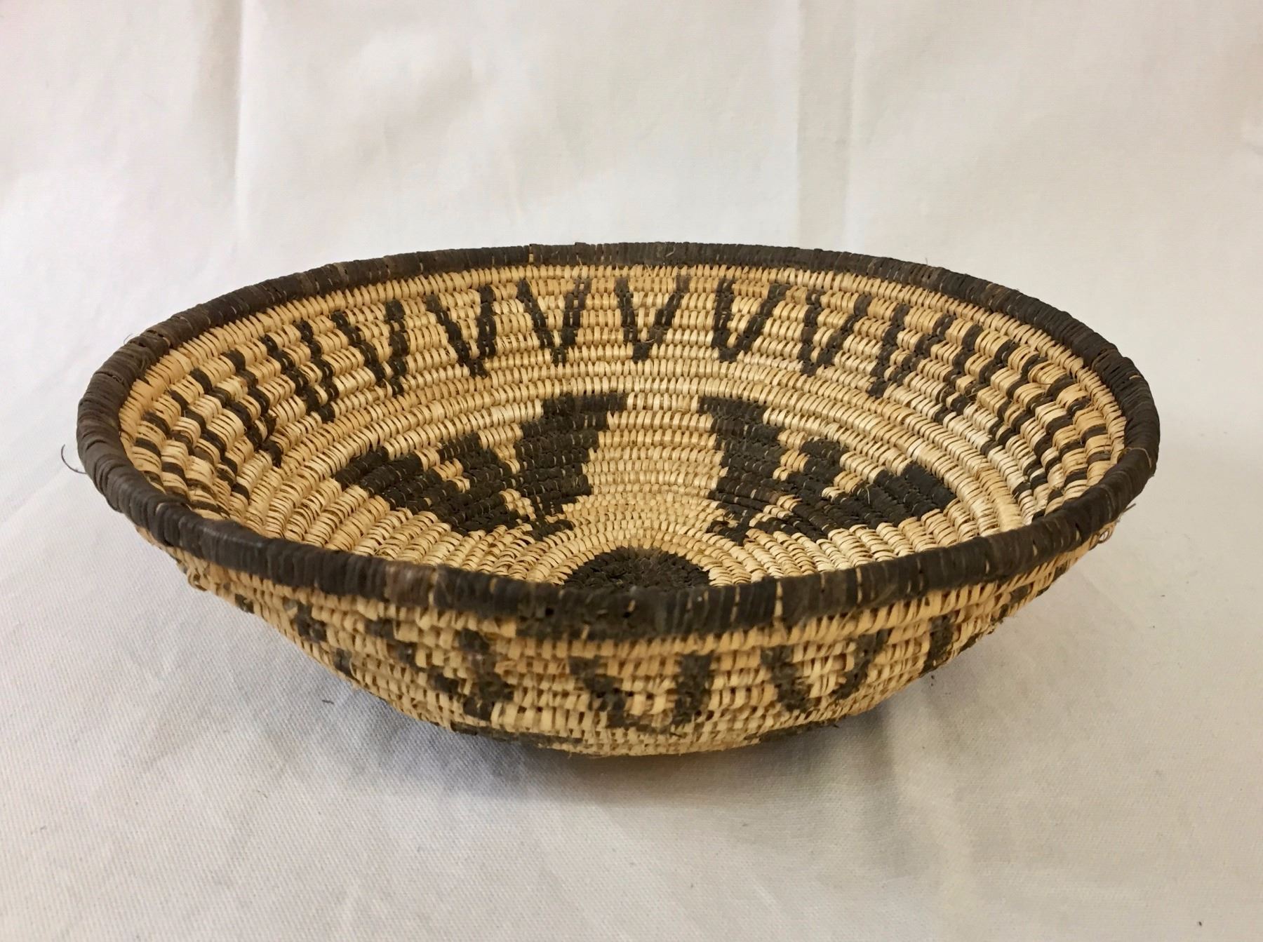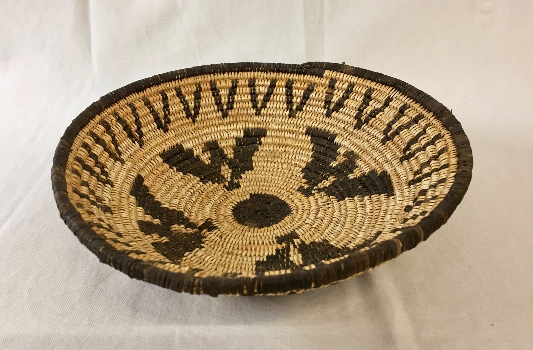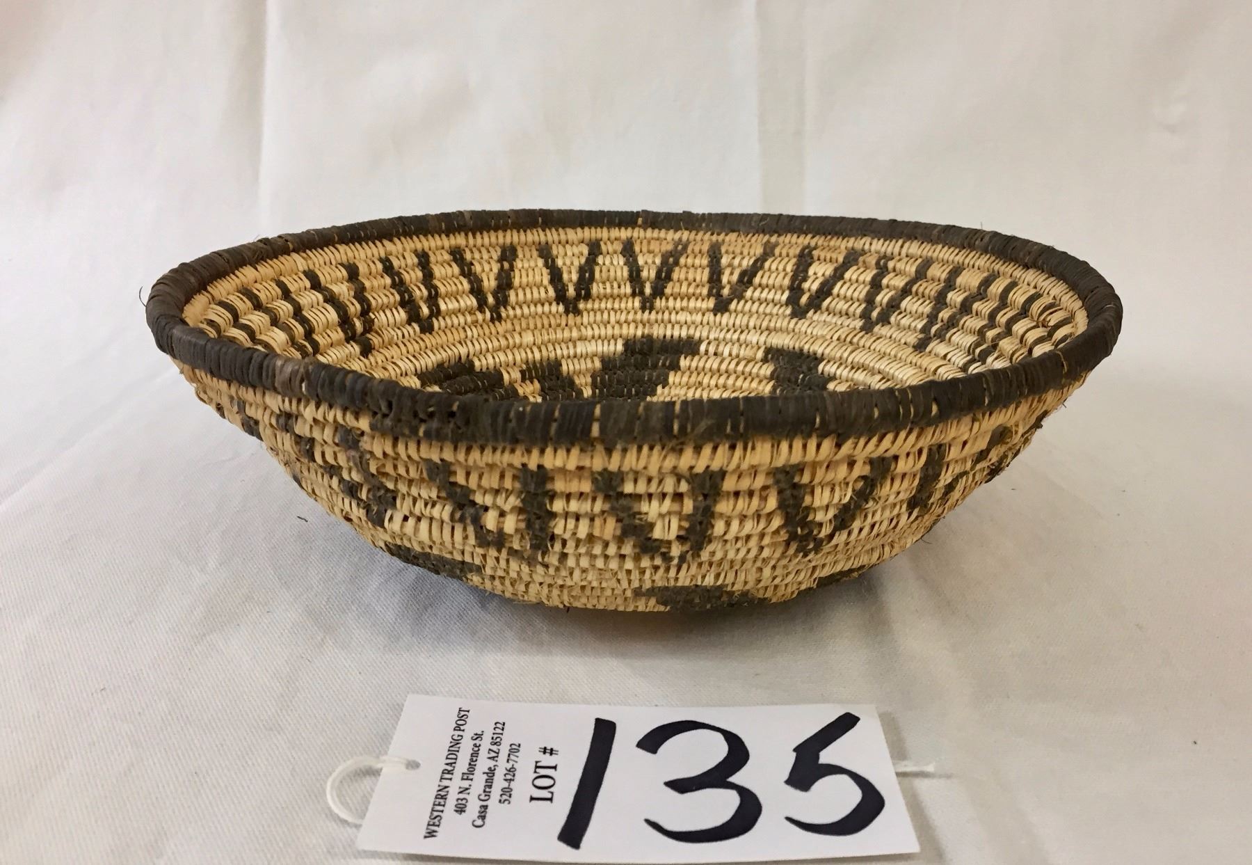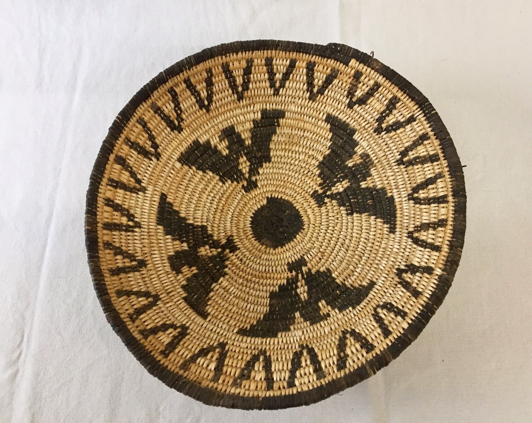 Description: A handmade Apache basket. Devil’s claw and willow. Maker: Unknown Apache weaver. Approx. Age: Fairly modern, circa 1980s. Size: 4” deep x 11” wide. Condition: Good for its age, normal wear expected. Please look closely at the pictures - they are an important part of our description. Shipping: There will be a $7 handling / packaging fee for shipping this lot. The actual cost of postage will be added on top of that.