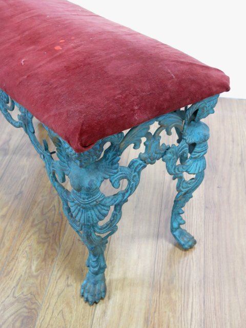 With metal claw feet and rust-colored velvet seat. Approx. 20" H x 30" W x 15" D.
