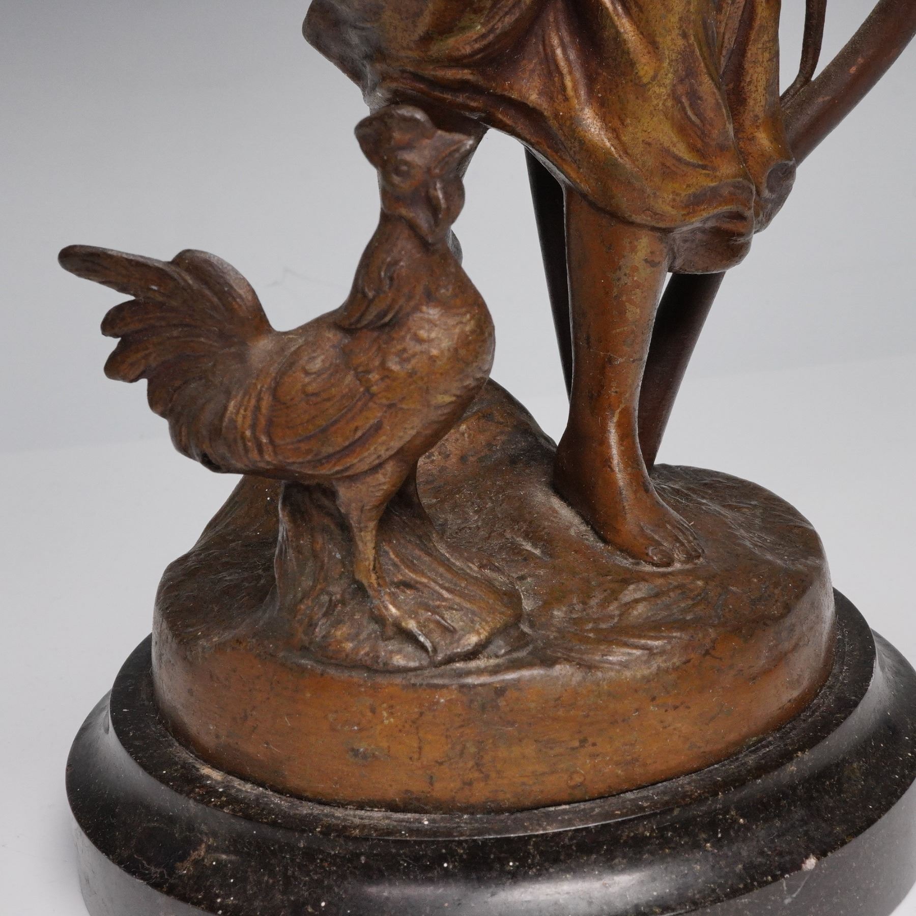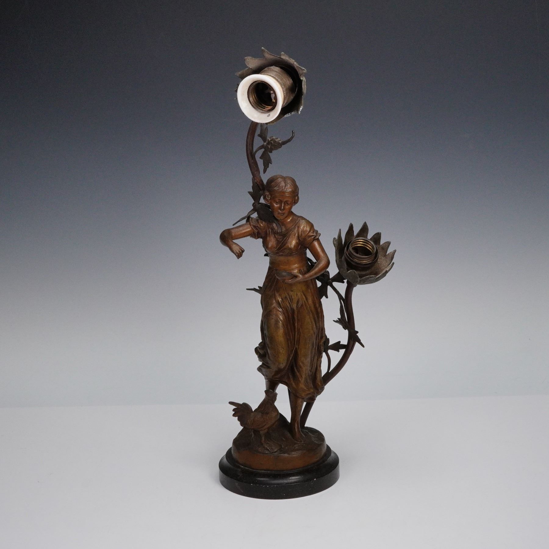 A decorative figural table lamp featuring a bronze-tone cast metal sculpture of a young woman in flowing dress with a rooster at her feet. Two floral form light sockets extend from leafy stems rising behind the figure, creating an Art Nouveau inspired aesthetic. Mounted on a round black marble base. No maker's marks observed.