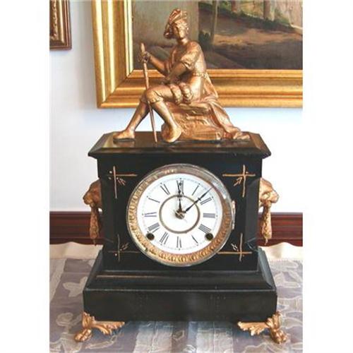 Lovely Mantle Clock attributed to The Gilbert Clock Co., Winsted, Conn. This clock is in running condition, however it probably needs a small adjustment as it tends to stop after a couple of days. Cast metal frame, gilded accents and gilded Cavalier figure on top. There is an old repair to the left corner, about 4", this is old and stable. There is a partial label on the bottom which leads me to believe this is from the Gilbert Clock Co., also I have researched the piece and found similar pieces made by this company. The label also has a "patent appl for date of 1888". Includes key. Measures 18"H x 12"W x 7"D.