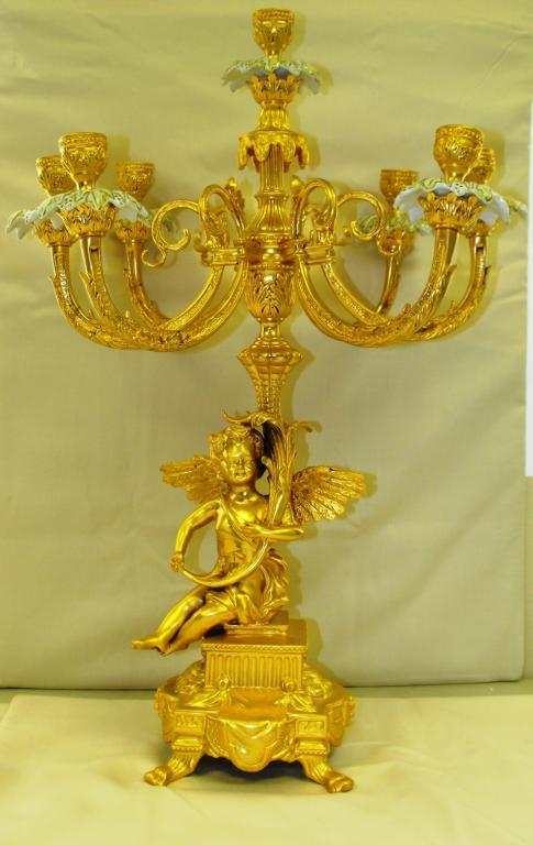 A very fine multi arm candlestick with porcelain bobeche. Figural Cherub center. 15 x 23