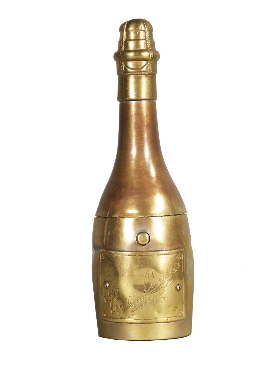 Figural Cigar Cutter and Match Holder, bottle shaped. Marked "Veuve Chyuot" on front. Some dents otherwise good condition. 2 1/4 X 6 3/4 X 2 1/4 inches.