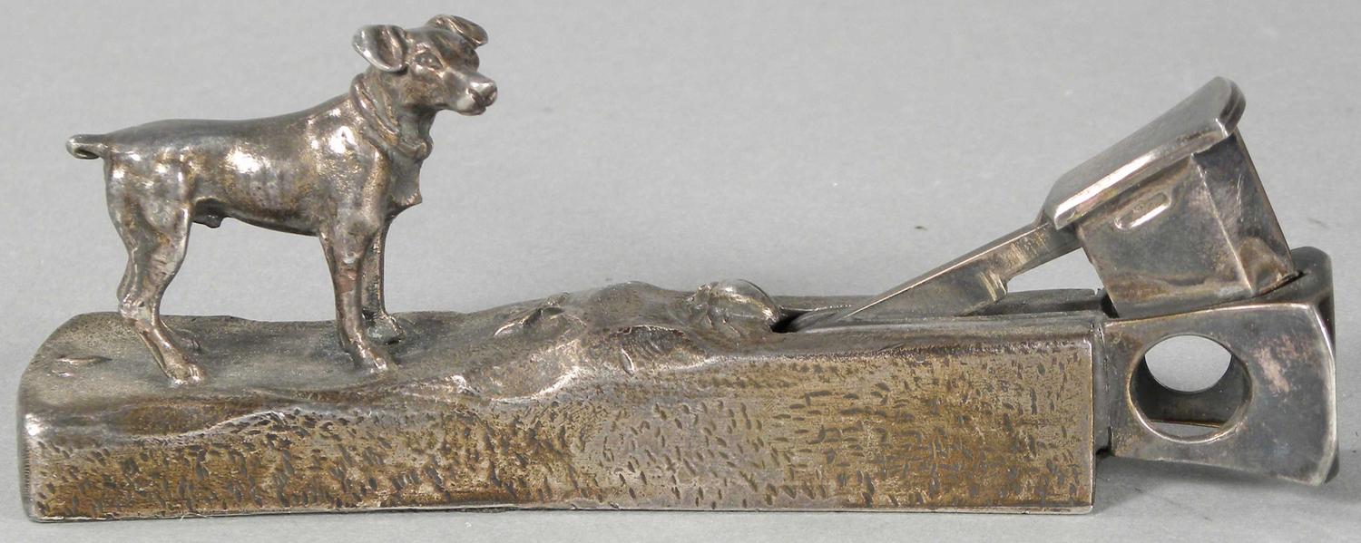Figural Cigar Tip Cutter, nickel plated brass. Depicting fox terrier. Excellent original condition. 5 inches long. Start Price $60