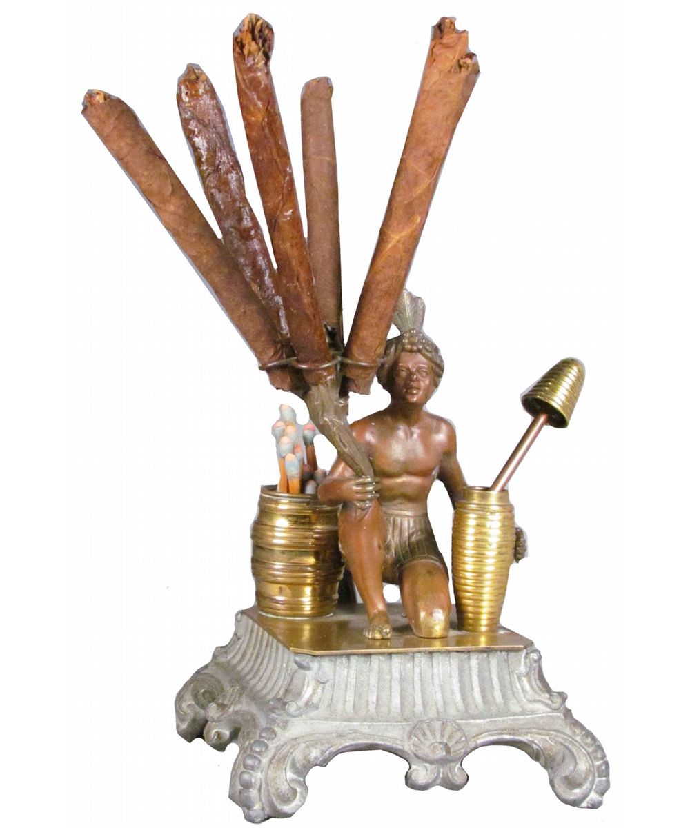 Figural Cigar and Match Holder and Lighter. Depicting male native. Brass and white metal. Very good condition. 4 1/2 X 6 X 4 1/2 inches. (Cigars not included)