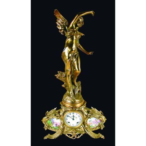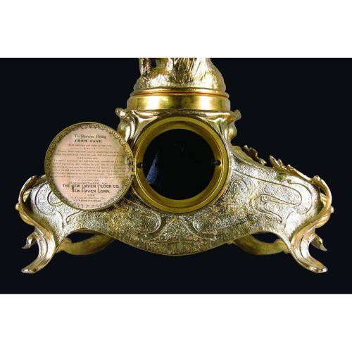Figural Clock with porcelain face Mfg. by New Haven Clock Co. Hand painted porcelain insets. Excellent condition. Worked at the time of photography. 28 inches tall, 16 inches wide at the base.