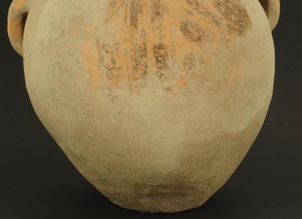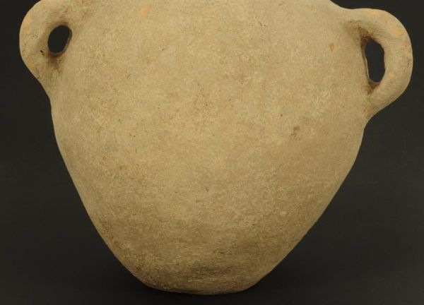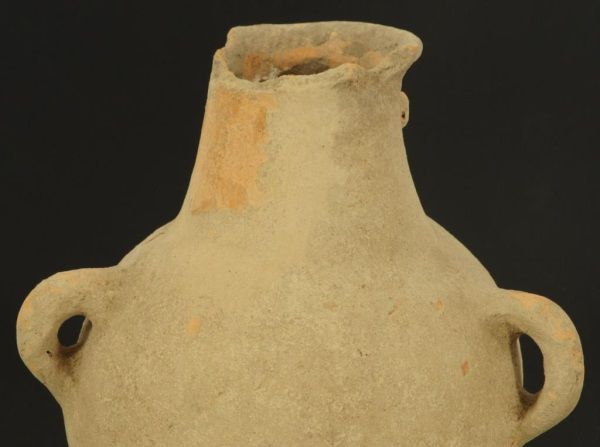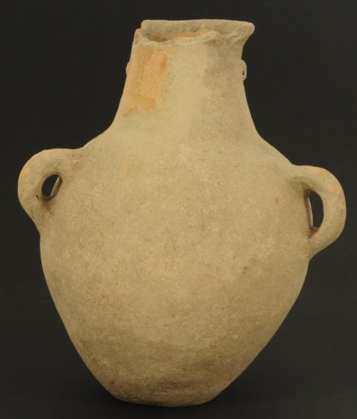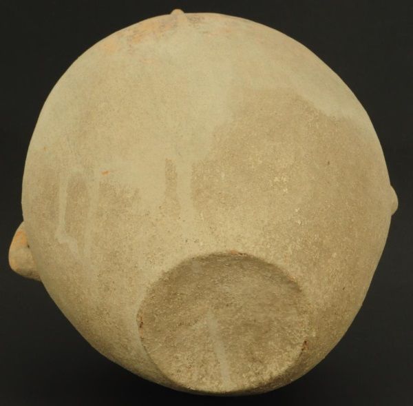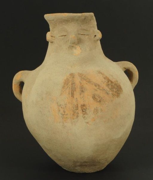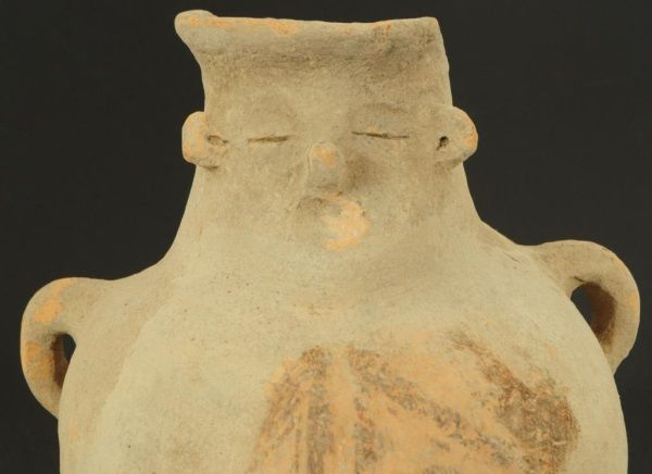 Figure of face on neck of vessel, with 2 handles. Measures approximately 10 1/2" tall. damage to the rim.