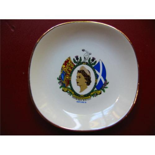 This gorgeous commemorative square plate is hand painted and crafted with image of Queen Elizabeth, and designed with sport motifs. It is 5 inch in diameter and is from 1970. It is marked and labeled with gold, surrounded by images sports memorabilia,Flags of Edinborgh & Scotland. It is Made in England and something to think about.