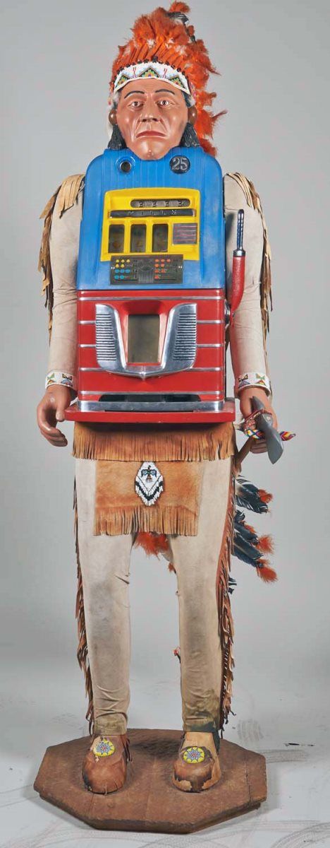 Figural Indian floor stand housing 25 ¢ Mills Industries High Top escalator bell slot machine c1948. On octagonal wood base w/ suede leather fringe outfit , tomahawk ax, feathered headdress & beaded detail throughout. Made by Richard Delong. Some wear to