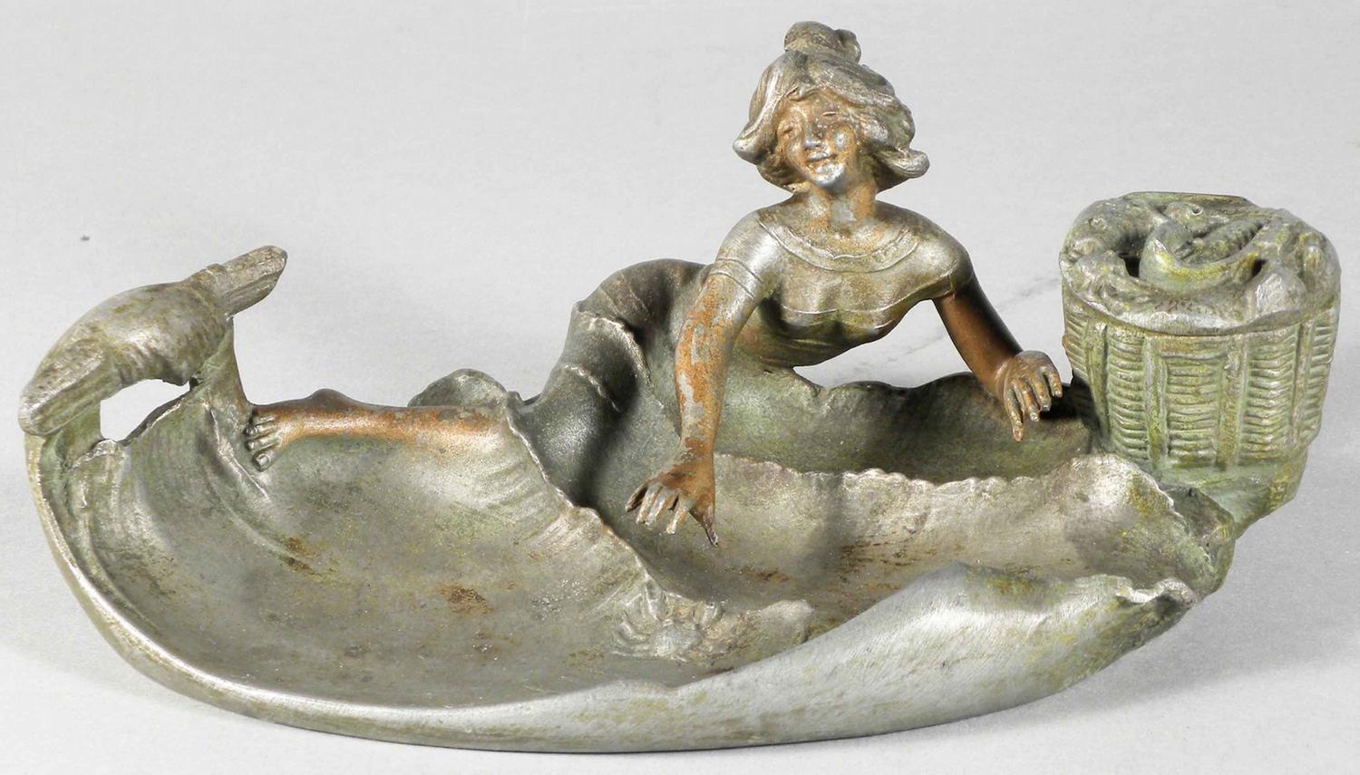Metal Figural Ink Well. Depicting woman lying near a pond reaching for a crab. Fish on Reservoir lid. Signed by the artist, I. Barthelemy. Very good condition. 7 1/2 X 3 X 4 inches. Starting bid $50