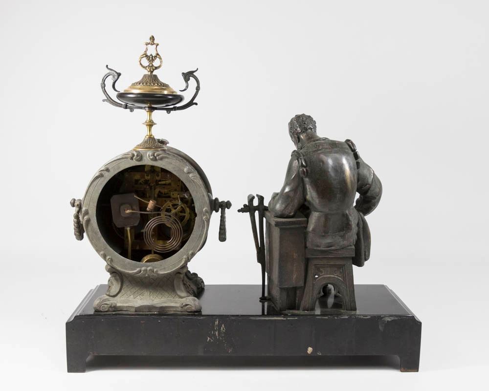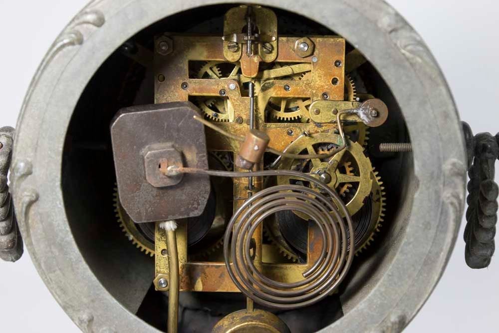 Open escapement. Approx. 19 1/4" H x 20 1/4" W. (6158) Damage to enamel dial. Back plate missing.
