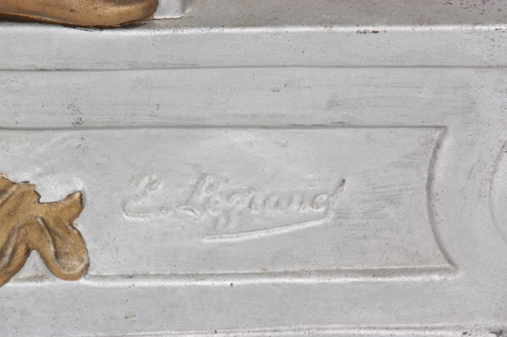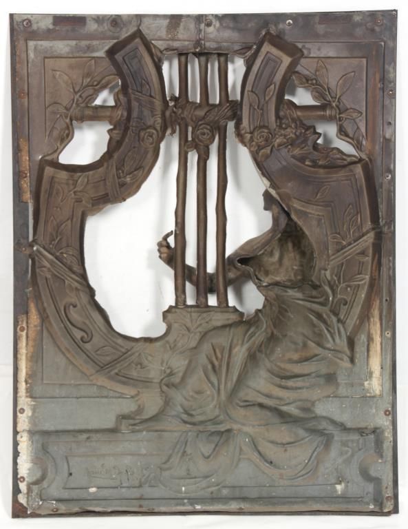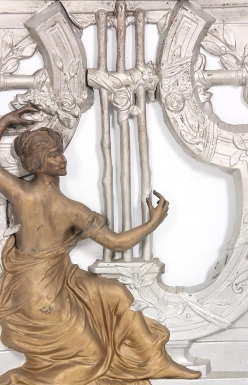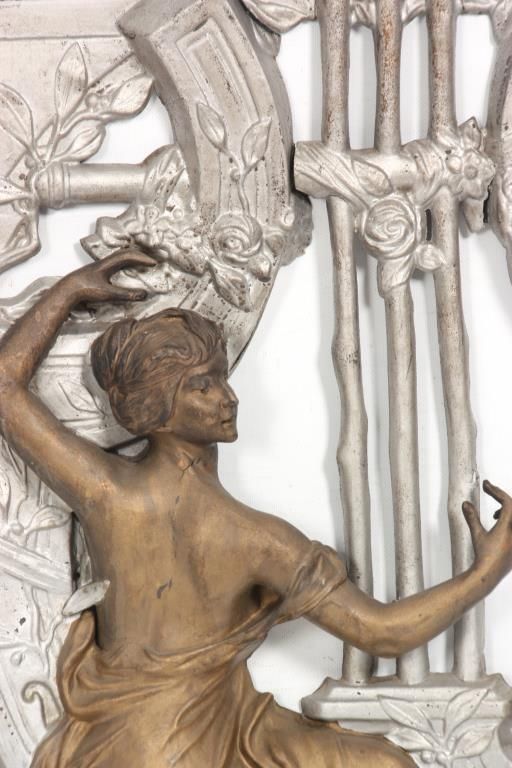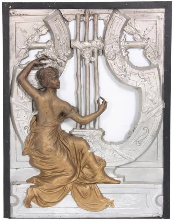 Figural Metal Fireplace Screen. Repousse decorated white metal 2 tone gilt and silver painted screen with figure of a woman posing in front of a large lyre with floral design, singed E. LeGrand. In good overall condition, has a few minor dings. 32 in. high x 24.5 in. wide.