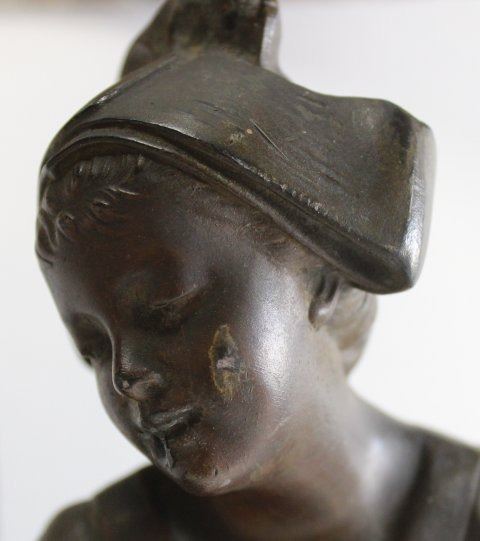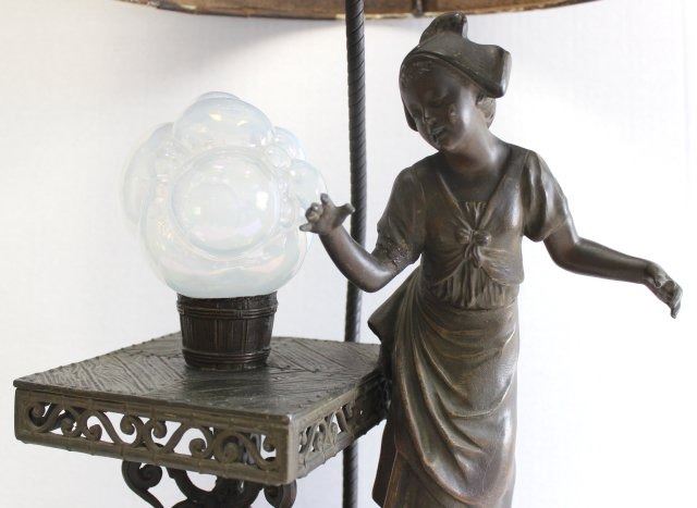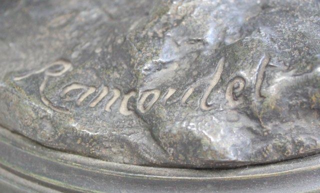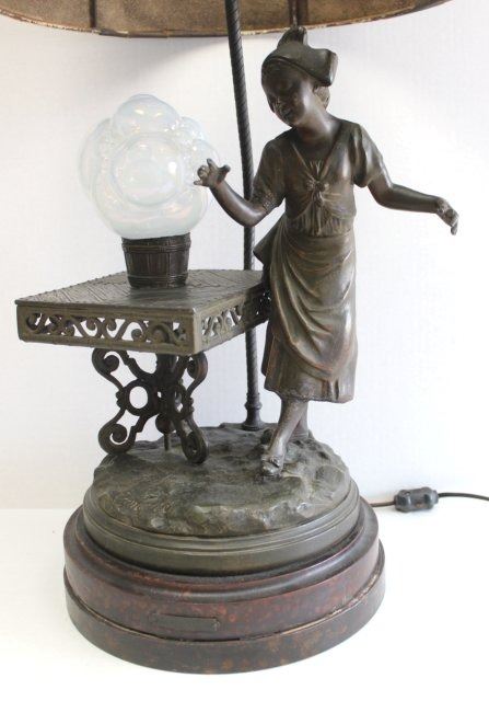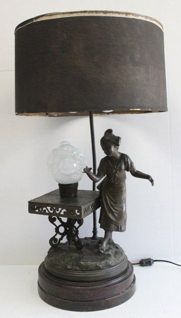Depicting woman standing next to table. Artist signed Rancoulet. Plaque reads "Souffleuse." On wood base. Figure approx. 14" H.