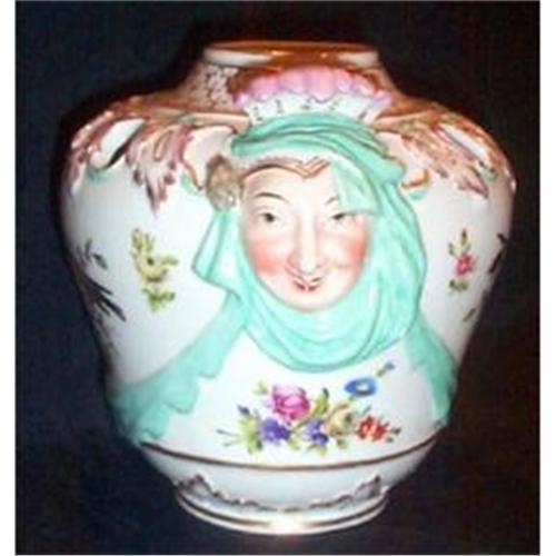 This Fantastic Bird Decorated and Figural Handled Potpourri Vase is in SUPERIOR condition with no chips, cracks, dings or hairlines and it measures 6.75" fro mhandle to handle and is 4" in diameter and stands 5" tall. It is marked on the bottom with a blue logo but I cannot identify it.