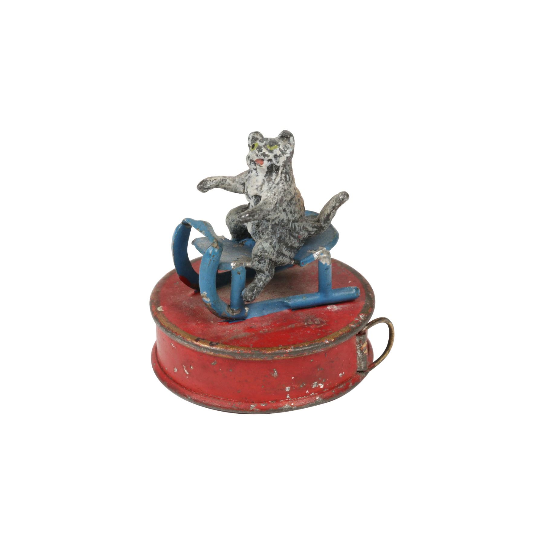 German. Circa 1900. Retractable sewing tape with painted metal cat on sleigh. 1.5" x 1.5". Minor paint scratches. Retracts properly. $50-100.