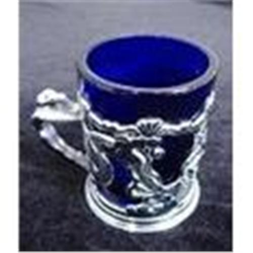<tr><td>Title:Figural Silver Plate and Cobalt Glass Mug</td></tr>