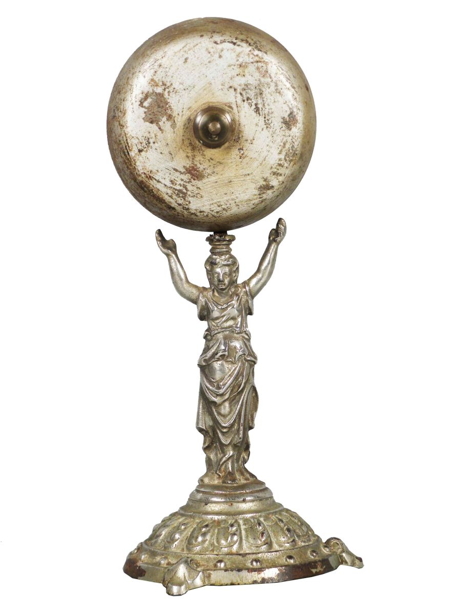 Figural Store Bell, Lady Liberty. Nickel plated, cast iron. Some rust mostly on back of bell otherwise good working condition. 3 1/2 X 8 X 3 1/2 inches.