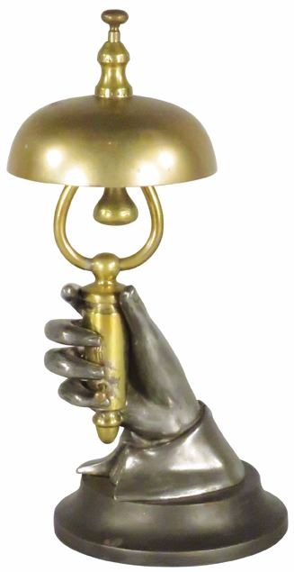 Figural Store Bell. Hand holding bell. Cast iron, white metal and brass. 7 3/4 inches tall.
