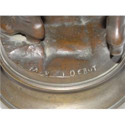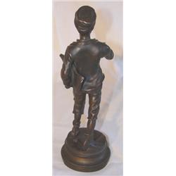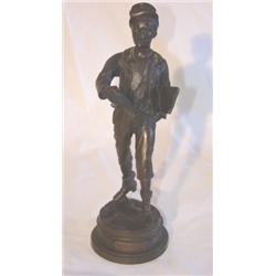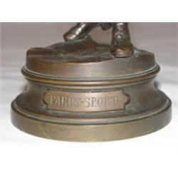 Figural bronze statue of Paris paperboy entitled "Paris-Sport." Signed Marcel Debut on base. 12" tall.