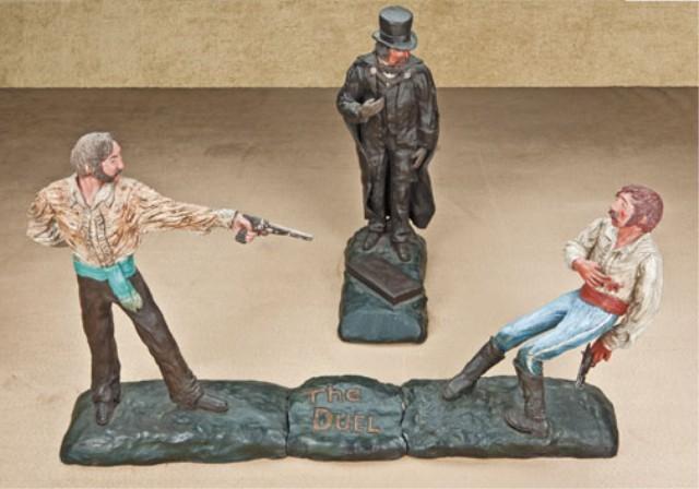 Figural group made of terra cotta, approx. 12-14” in height, entitled “The Duel”. Four pieces, showing judge, two duelists, and display plaque. Very nicely accomplished on commission for Col. Orbelo by Steward Short of Texas, about 1971. One of a kind figural group that was used in many displays. Beautifully handmade and hand painted, in good condition. From the William R. Orbelo Collection. Est: $500 - $1,000