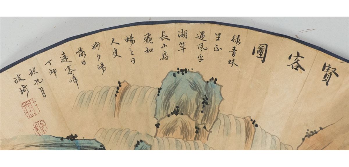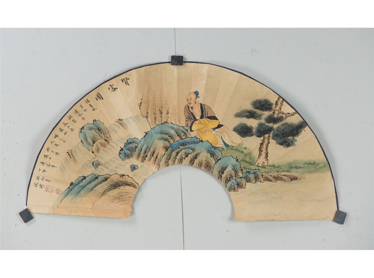 Figure and landscape, fan painting, Chinese ink and watercolour on paper, signed and sealed. 63 cm x 21 cm.