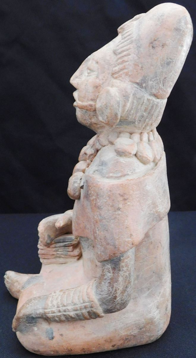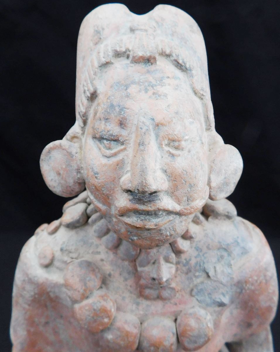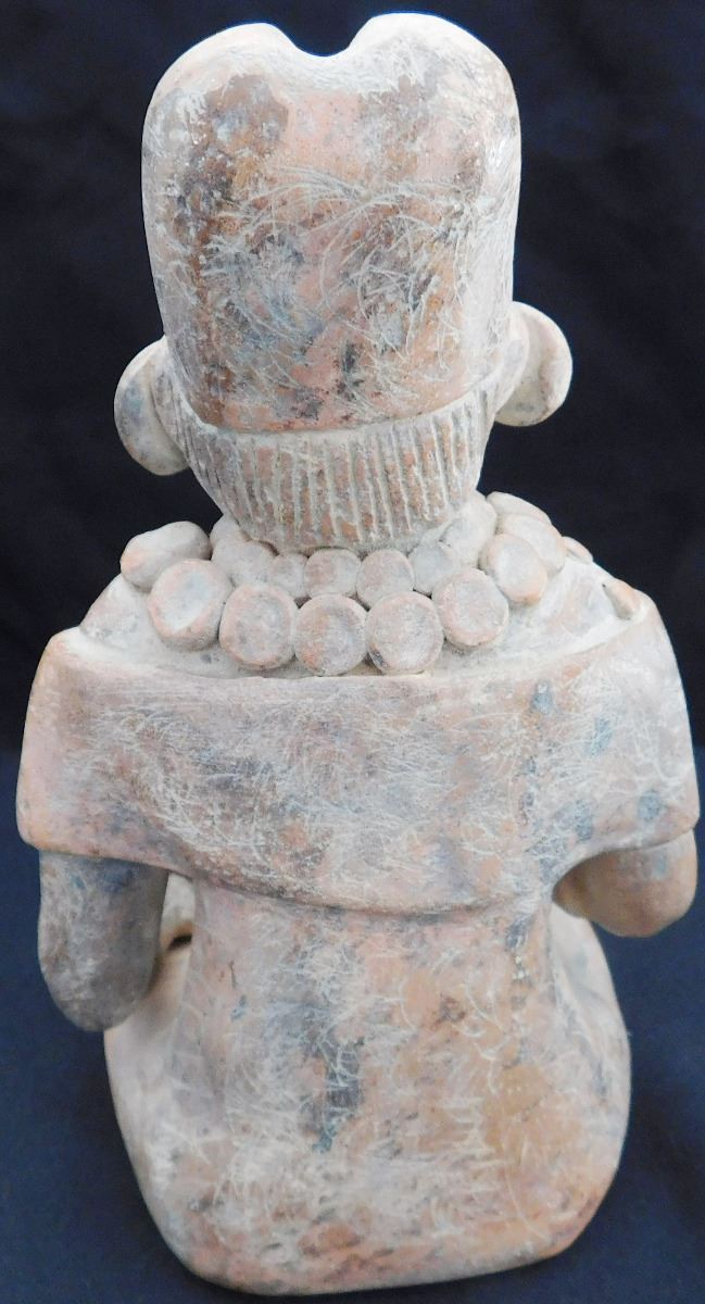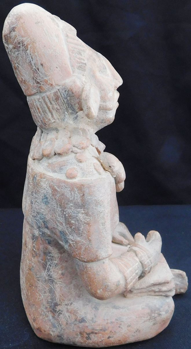Figure of Mayan Priest, circa 1000 years old. It is made of clay and paint and measures 7 x 4 x 4 inches. Mayan, Jaina Island. Condition: There are a couple of necklace beads missing, see images. Shipping: $24.00