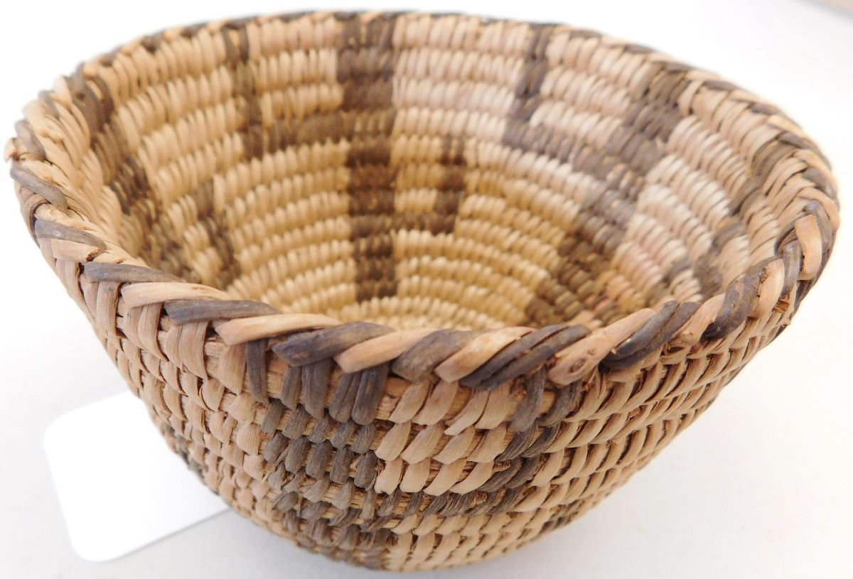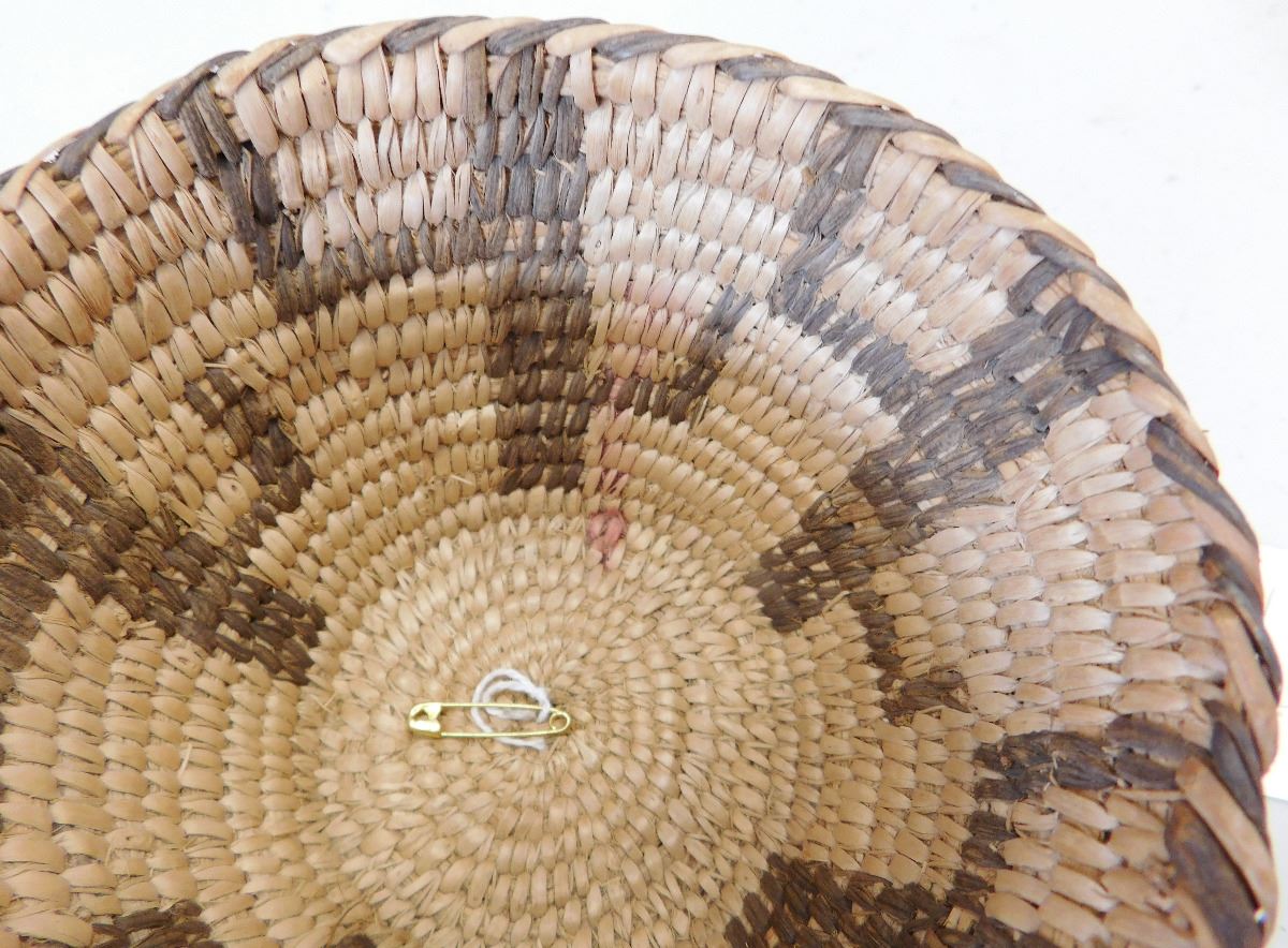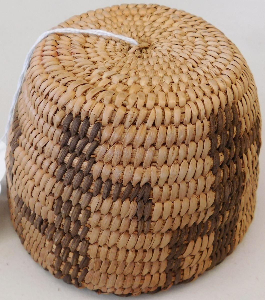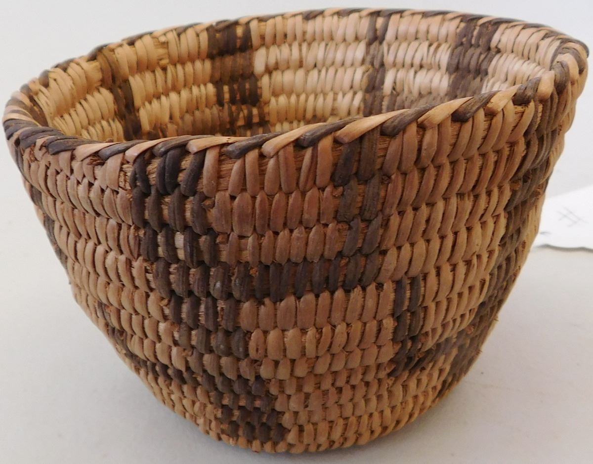 Figured Pima Basket, circa 1940s and measuring 3 x 4 .5 inches and has a cactus design. Nice stitching in the basket made from willow and devil's claw. Condition: Very Good condition, see images. Shipping: $15.50.