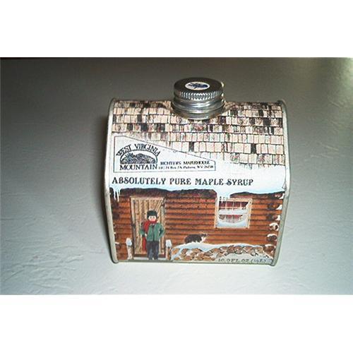 Featuring a vintage decorative cabin shaped tin. This tin is beautifully decorated. Statements on the outside of the tin are: West Virginia Mountains - Ritchter's Maple House Of Pickens, West Virginia - Absolutely Pure Maple Syrup - 16.9 fluid ounces. The bottom of the tin also tells some history of maple syrup from the Indians point of view which is: The Indians called it "SINZIBUKWUD." The Indians taught the first white settlers how to tap maple trees in the spring, then evaporated the sweet sap until it became maple syrup. In Ben Franklin's time, plans were afoot to make America self-sufficient in sugar production, using maple syrup. Also on the tin is these words: SIROP D'ERABLE ABSOLUMENT PUR. A very decorative tin which shows on one end two little girls and a horse; one setting on the horse and one holding the reins. The other side shows a small boy pouring water in a bowl for the lovely collie dog. Snow covers the ground on all sides. All beautiful winter scenes.