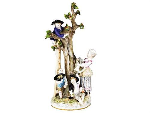 Colour painted and gilt porcelain. Round base, people picking apples. Restored. Johann Joachim Kandler’s and Friedrich Elias Meyer’s model (1753) from the serial children gardeners. Johann Joachim Kandler’s and Friedrich Elias Meyer’s model (1753)